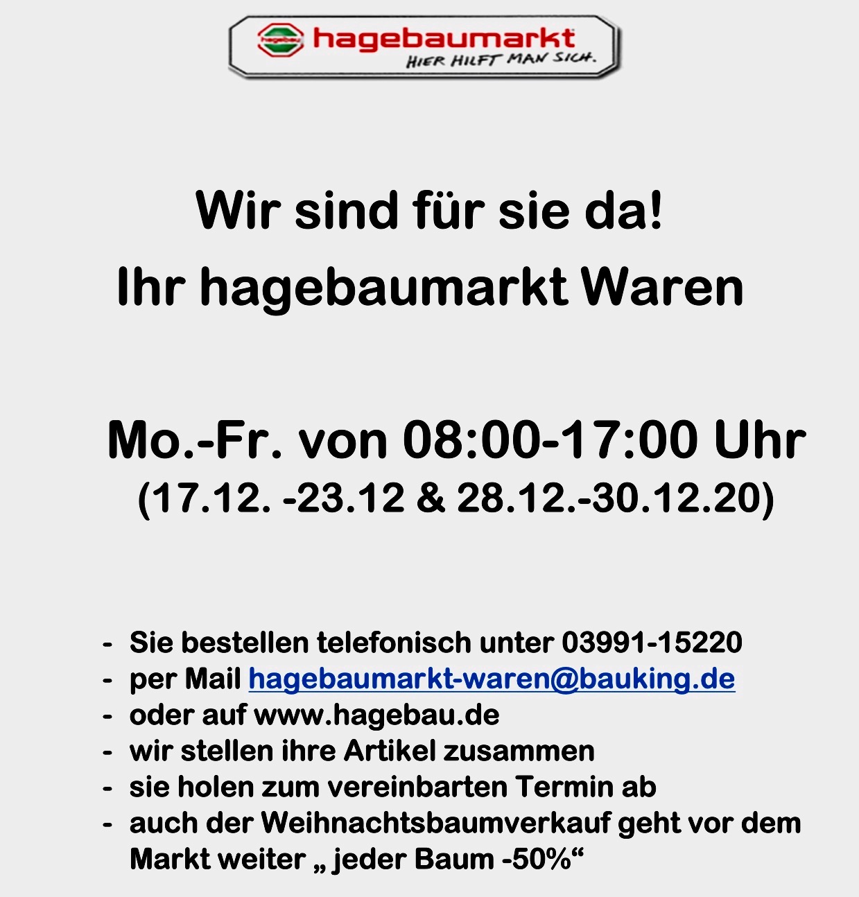 Auch die Mitarbeiter des Warener hagebaumarktes sind weiter für die Kunden da und bieten die Weihnachtsbäume sogar zu besonderen Preisen an: