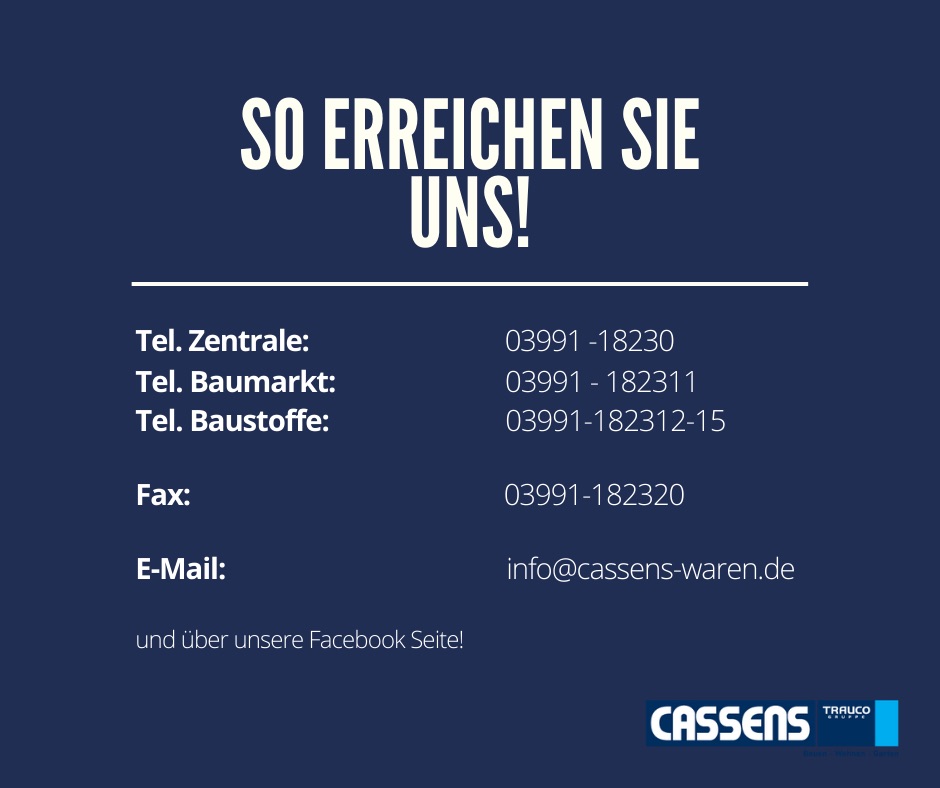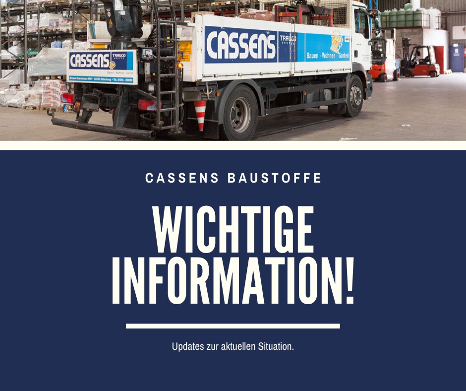 Während Handwerker ihre großen Baustoffe auch weiterhin ganz normal beziehen dürfen, können Privatkunden ab sofort telefonisch, per Mail, Fax oder den Facebook-Account von Cassens bestellen.