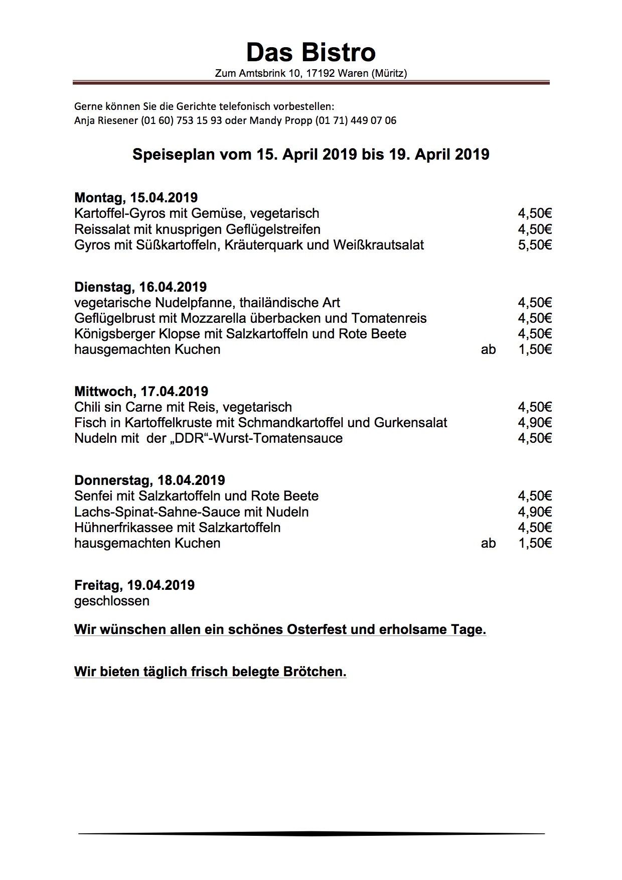 Der Speiseplan für „Das Bistro“ am Warener Amtsbrink (ehemals Sylvis Bistro):