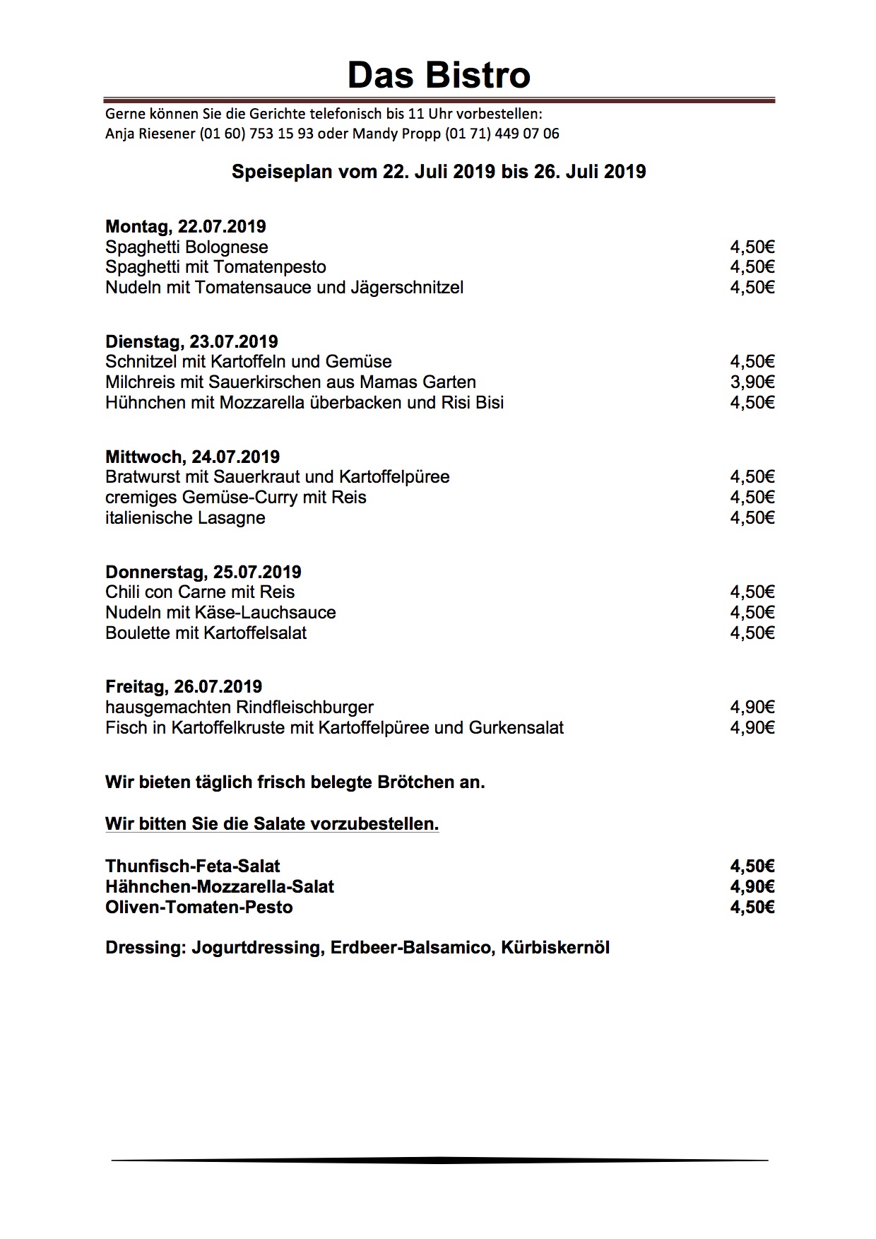 Pasta-Tag heute in „Das Bistro“ am Warener Amtsbrink. Hier der Speiseplan für diese Woche: