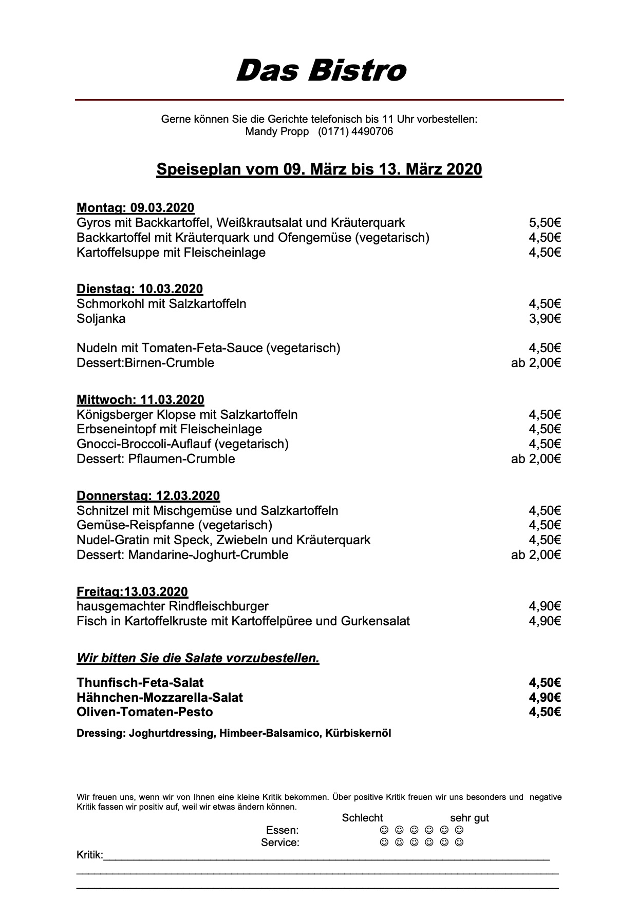 Hier der aktuelle Speiseplan von „Das Bistro“ am Warener Amtsbrink: