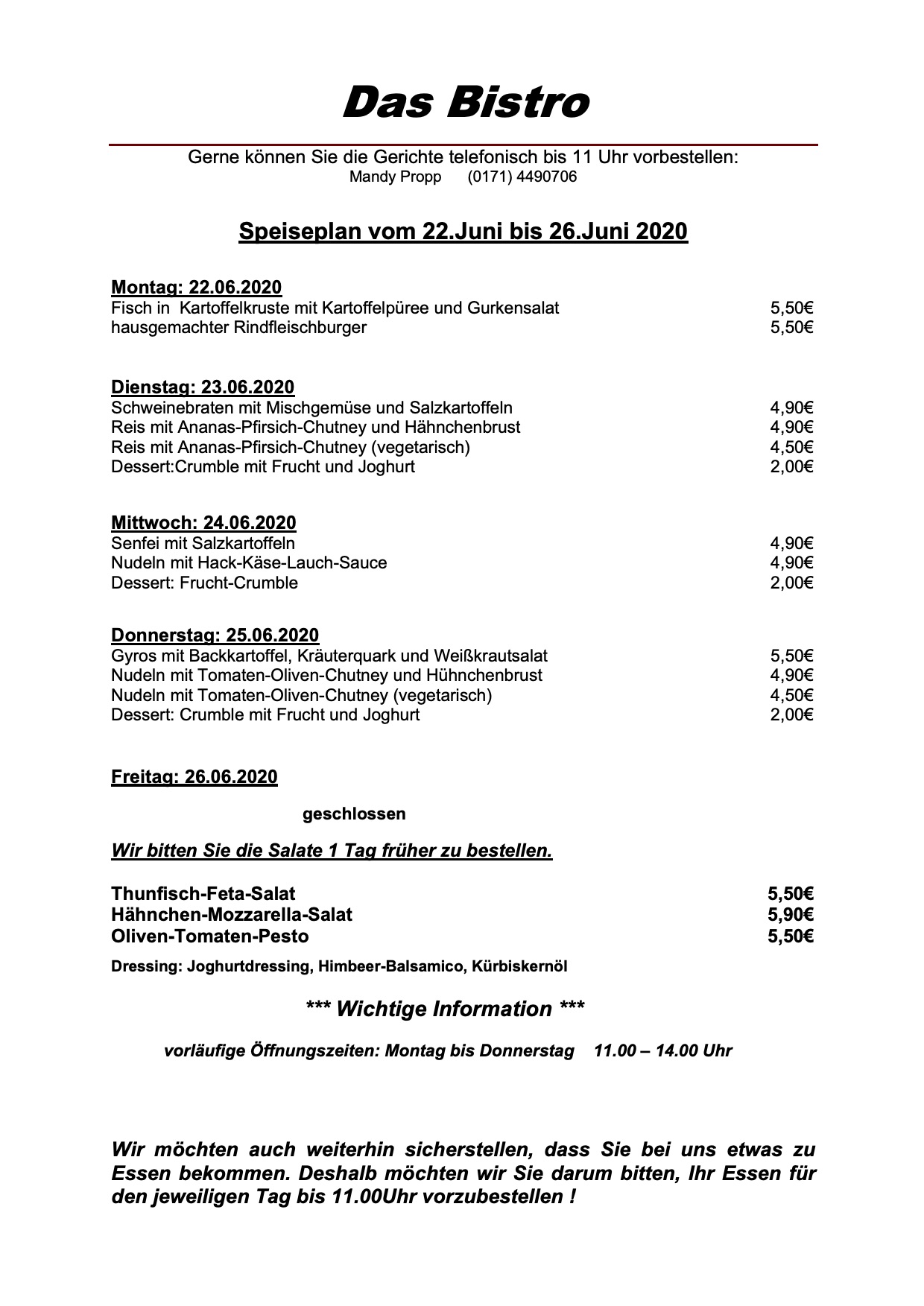 Hier der aktuelle Speiseplan für „Das Bistro“ am Warener Amtsbrink: