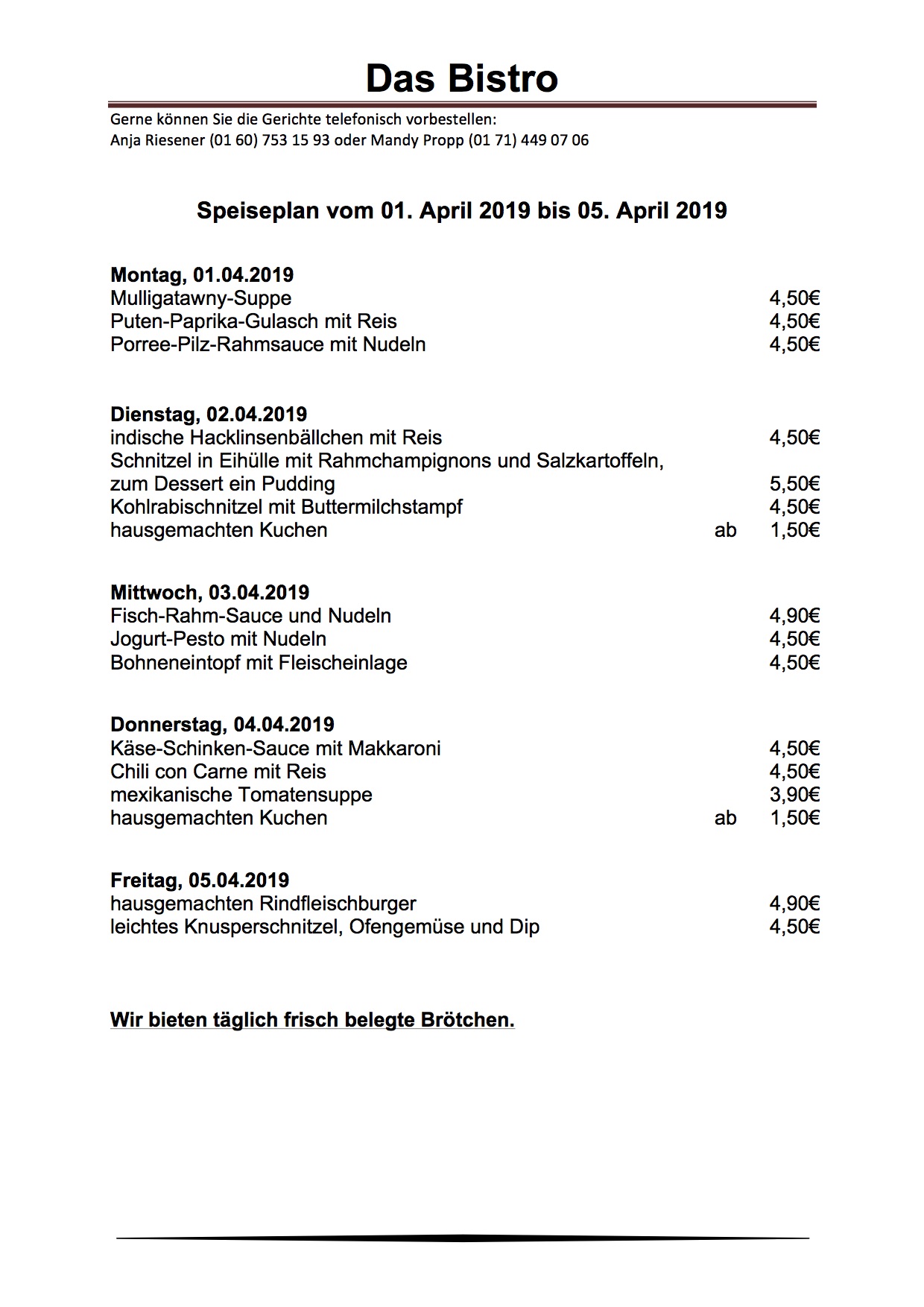Und das gibt es in dieser Woche im „Das Bistro“ (ehemals Sylvis Bistro) am Warener Amtsbrink: