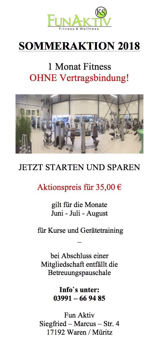 Noch immer keine Strandfigur oder einfach nur Lust auf etwas mehr Bewegung? Dann sollten Sie sich dieses Angebot einmal genauer anschauen: Das Warener Fitnessstudio „FunAktiv“ mit Sitz in der Siegfried-Marcus-Straße startet heute eine große Sommeraktion.