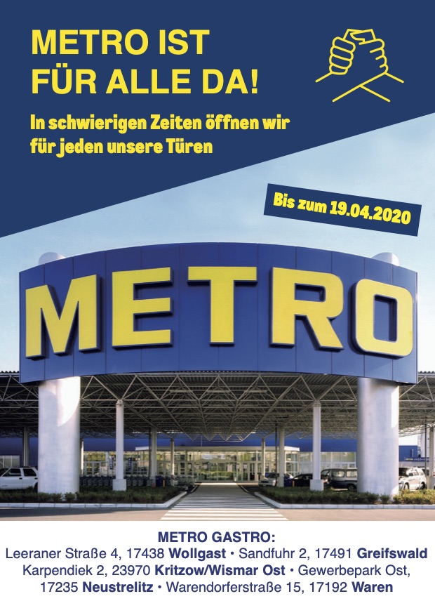 Auch in Waren gibt es einen METRO-Markt, und zwar in der Warendorfer Straße 15. Die Regeln, die für alle Einkaufsmärkte gelten, werden natürlich auch hier eingehalten.