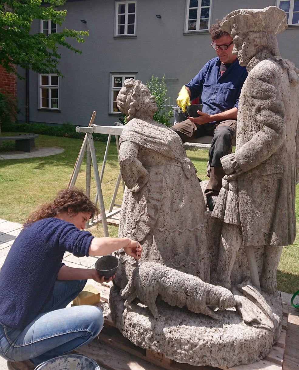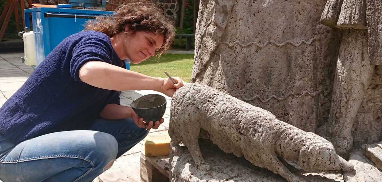 Vorsichtig streicht Friederike Hamann Spezialmörtel in kleine Löcher, die auf der Oberfläche einer Brunnenfigur klaffen. „Diese Löscher sind zum Teil über die Jahre vom Wasser ausgewaschen und bilden eine Gefahr für die Skulptur“, erläutert die Restauratorin. Die Fachfrau arbeitet im Hof des Neubrandenburger Regionalmuseums an der Johanniskirche an einem der bekanntesten Denkmäler der Kreisstadt – dem „Mudder-Schulten-Brunnen“. Das Denkmal aus dem Jahr 1923 besteht aus Muschelkalk, der damals in Franken gewonnen wurde und für viele Skulpturen und Denkmäler zum Einsatz kam.