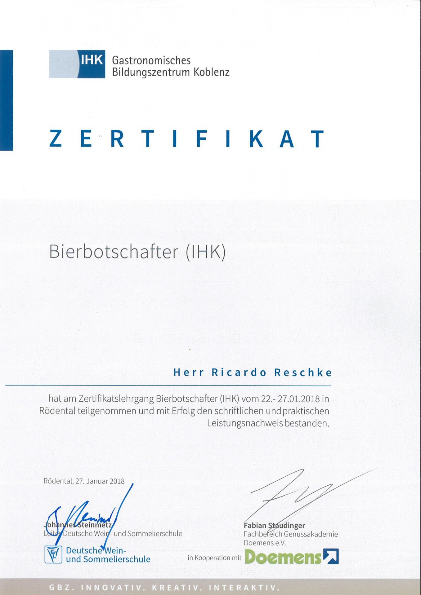 Garant für die bundesweit einmalige Weiterbildung und ihr hohes Qualitätsniveau sind das gastronomische Bildungszentrum der IHK Koblenz (Deutsche Wein- und Sommelierschule) und der traditionsreiche Seminar-Branchenprimus Doemens Academy (Gräfelfing). Den Lehrgang leitete Biersommelier Hans Wächtler, der mit seiner Firma „Bierbegeisterung“ weltweit Vorträge, Verkostungen und Seminare anbietet. Die Kooperationspartner haben sich zum Ziel gesetzt, gemeinsam den Lehrgang zum Bierbotschafter (IHK) als qualitativ hochwertige Fort- und Weiterbildungsmaßnahme zum Themenbereich Bier anzubieten und durch entsprechende Vermarktung zu etablieren.