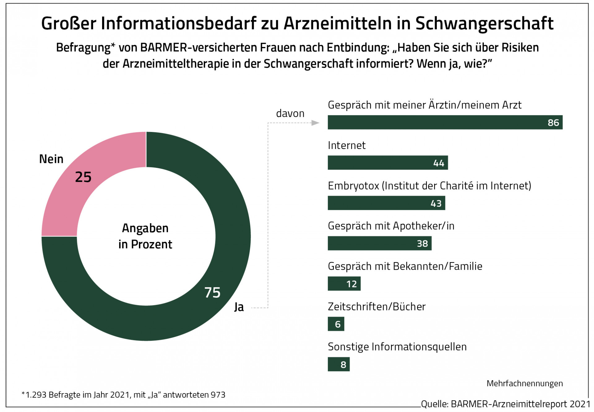 Laut Arzneimittelreport dürften rund 30 Prozent der Frauen vor einer Schwangerschaft regelmäßig Arzneimittel einnehmen. Allerdings besitzt offenbar nur eine kleine Minderheit einen Medikationsplan. Das legt eine vertiefende Umfrage für den Arzneimittelreport nahe. Befragt wurden dabei knapp 1.300 BARMER-Versicherte, die im vergangenen Jahr entbunden haben. „Der Schutz des ungeborenen Kindes muss schon vor der Schwangerschaft beginnen. Dazu sollte die Gesamtmedikation junger Frauen grundsätzlich auf kindsschädigende Risiken geprüft werden. In der Schwangerschaft kommt ein Medikamenten-Check zu spät, um das ungeborene Kind vor Schäden zu schützen“, sagte der Autor des Arzneimittelreports, Prof. Dr. med. Daniel Grandt, Chefarzt am Klinikum Saarbrücken.