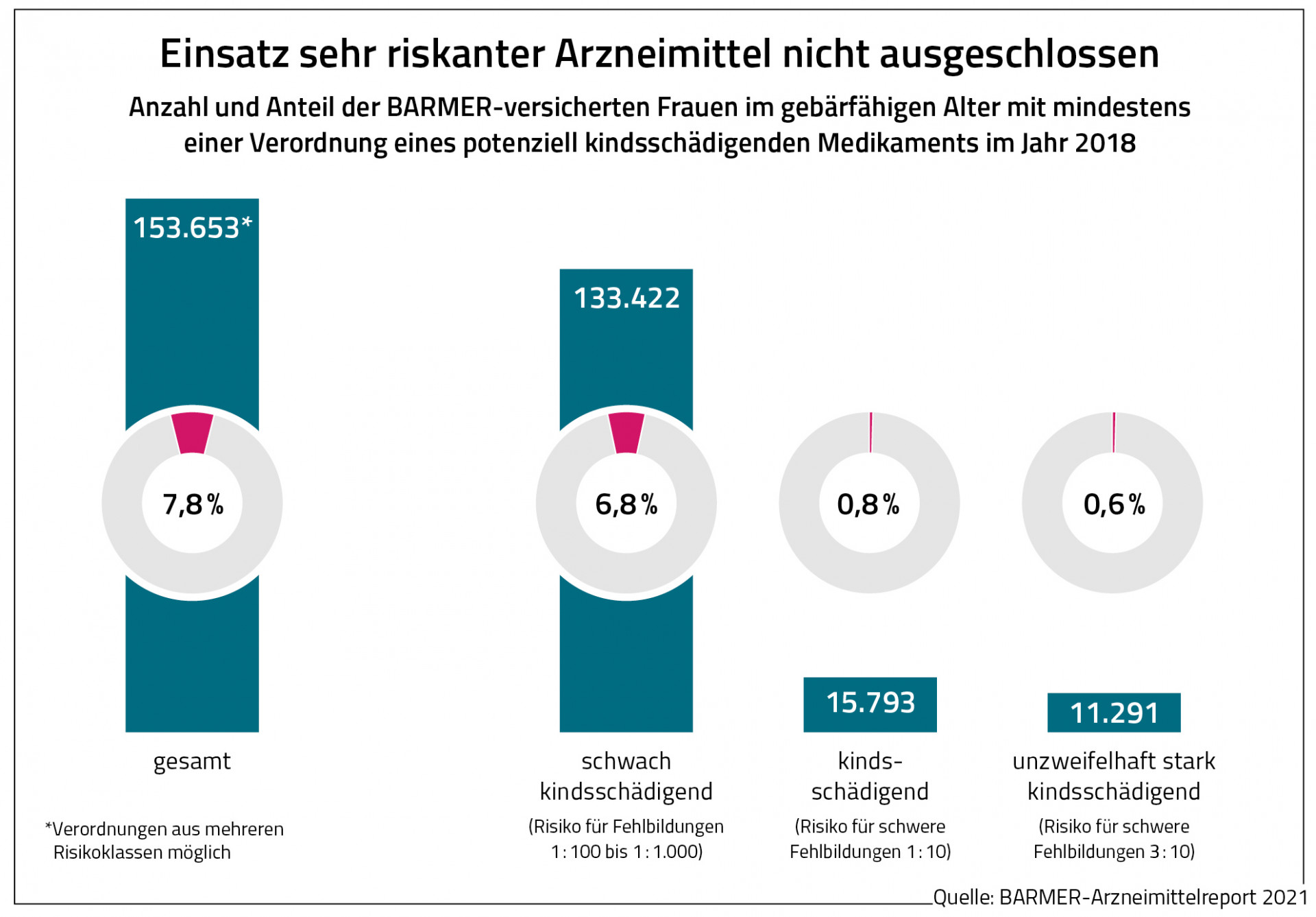 Viele Frauen im gebärfähigen Alter bekommen potenziell kindsschädigende Arzneimittel verordnet, auch Teratogene genannt. Allein bei der BARMER waren im Jahr 2018 fast 154.000 Frauen zwischen 13 und 49 Jahren davon betroffen. Problematisch wird deren Einnahme ab dem Beginn der Schwangerschaft. Im ersten Schwangerschaftsdrittel bekamen 663 von rund 66.500 BARMER-Versicherten mit Entbindung im Jahr 2018 Teratogene verordnet. Das geht aus dem Arzneimittelreport 2021 hervor, den die BARMER am Donnerstag vorgestellt hat. „Die grundsätzliche Verordnung von Teratogenen vor einer Schwangerschaft ist nicht das Problem. Vor allem dann nicht, wenn verhütet wird. Spätestens mit Eintritt der Schwangerschaft darf aber kein Teratogen mehr zum Einsatz kommen. Genau genommen muss der Schutz des ungeborenen Kindes bereits davor beginnen“, sagte der Vorstandsvorsitzende der BARMER, Prof. Dr. med. Christoph Straub. Deshalb sollten auch Frauen im gebärfähigen Alter mit Dauermedikation einen Rechtsanspruch auf einen bundeseinheitlichen Medikationsplan erhalten.