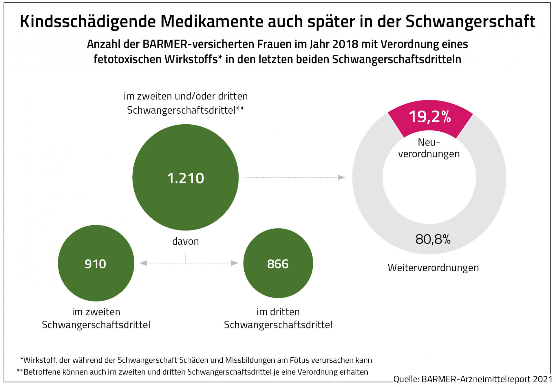 Wie aus dem Arzneimittelreport weiter hervorgeht, bekommen Frauen auch im späteren Verlauf der Schwangerschaft Arzneimittel mit Risiken der Schädigung des ungeborenen Kindes verordnet. Demnach traf dies auf 1.210 BARMER-versicherte Frauen mit Entbindung im Jahr 2018 zu. „Zu einem späten Zeitpunkt der Schwangerschaft sind solche Arzneimittel im Einzelfall eventuell akzeptabel, weil die Gefahr für Missbildungen und Schädigungen des Kindes dann etwas geringer ist. Deren Verabreichung muss dann aber zwingend im Medikationsplan stehen“, forderte Grandt. Für einen bestmöglichen Schutz sei ein weiterer Schritt erforderlich. In Großbritannien etwa gelte das Verschreiben eines teratogenen Arzneimittels in der Schwangerschaft als „never event“. Das seien Ereignisse, die grundsätzlich vermeidbar seien und solche katastrophalen Konsequenzen hätten, dass sie nie auftreten dürften. „In Deutschland muss die Verordnung teratogener Arzneimittel ebenfalls zum ,never event‘ werden, zumindest in der Frühschwangerschaft“, sagte BARMER-Vorstandschef Straub.