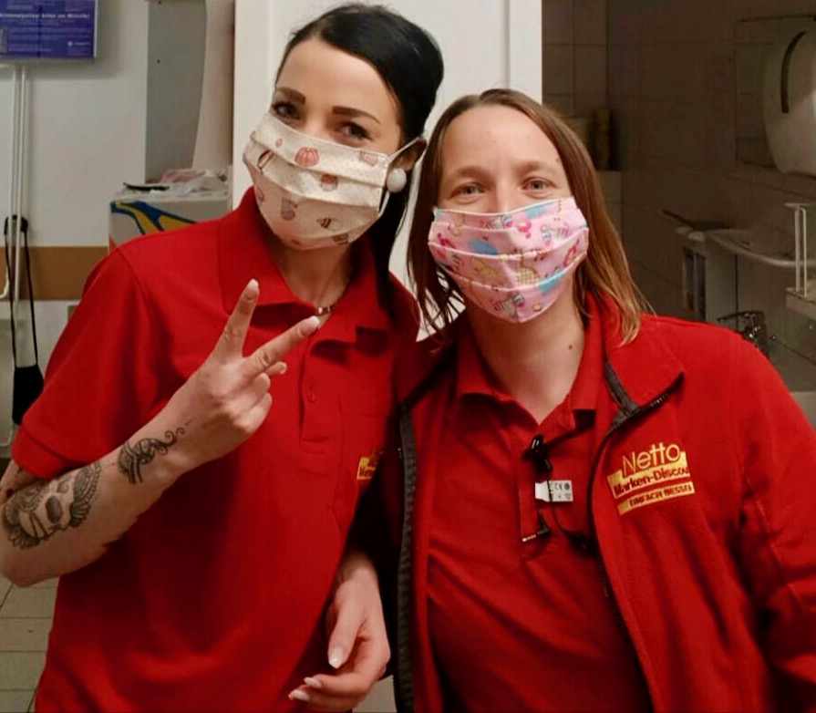 Unser Bild zweigt zwei Mitarbeiterinnen eines Warener Supermarktes, die von Anett und Manuela mit Mundschutz versorgt wurden und sich sehr darüber freuen.