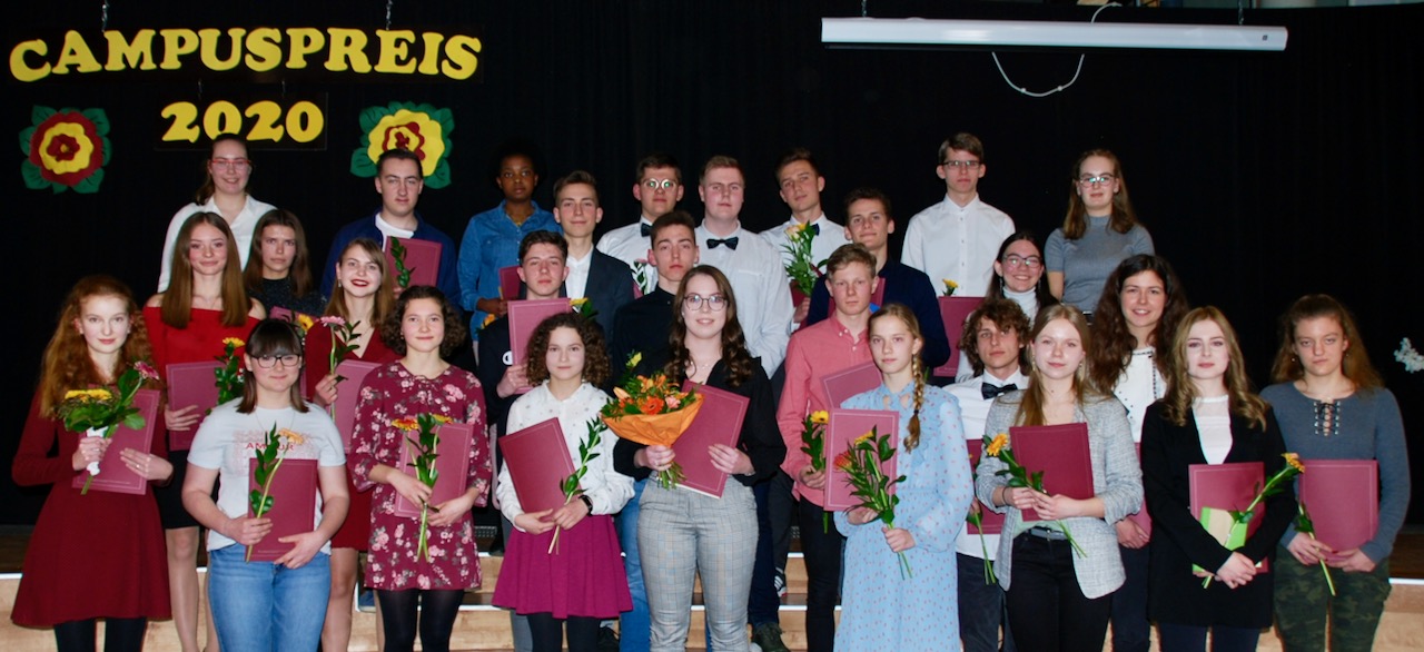 Schließlich, durch das Trompetensolo des Neuntklässlers Joris Taube angekündigt, kam das Programm zum Höhepunkt des Abends: Die Verleihung des Campuspreises 2020. Schon Wochen vorher gab es große Spekulationen und Gerüchte unter der Schülerschaft, wer dieses Jahr die große Ehre bekommt, den gläsernen Pokal in der Hand zu halten.