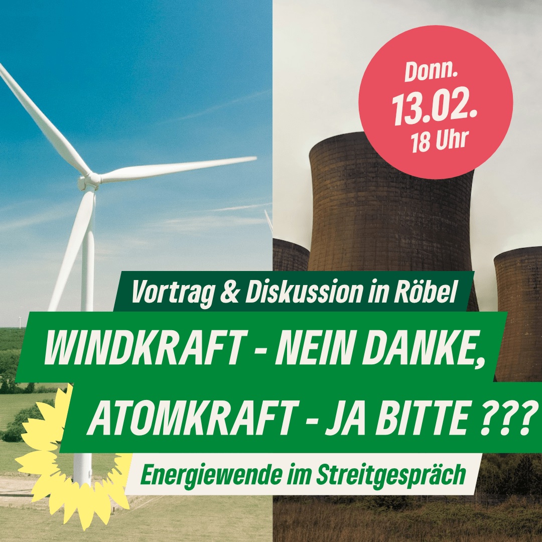 „Windkraft – Nein, Danke! | Atomkraft – Ja, bitte?“ heißt eine Veranstaltung des Röbeler Ortsvereins von Bündnis90/Die Grünen am kommenden Donnerstag, 13. Februar, im Engelschen Hof. „Die Pläne zum Windkraftausbau bundesweit sind hochambitioniert. Im Landkreis Mecklenburgische Seenplatte wurden in einigen Gebieten deutlich mehr Potentialflächen definiert als in anderen. Proteste und Mahnwachen waren die Folge. Mittlerweile wird der Ruf nach Atomkraftwerken wieder lauter – als vermeintlich billige und saubere, umweltschonende Energie. Als das Nationale Begleitgremium bei der Suche nach einem Endlager auch Areale in der Seenplatte in Betracht gezogen hat, formierte sich auch hier Protest. Wie kann es in dieser Frage weitergehen“, heißt es in der Einladung. Moderiert wird das Streitgespräch, das um 18 Uhr beginnt, von Dr. Gerd Rosenkranz, Journalist und Autor. Kritische Fragen sind erwünscht, der Eintritt ist frei. Ort: Engelscher Hof, Kleine Stavenstraße 10.