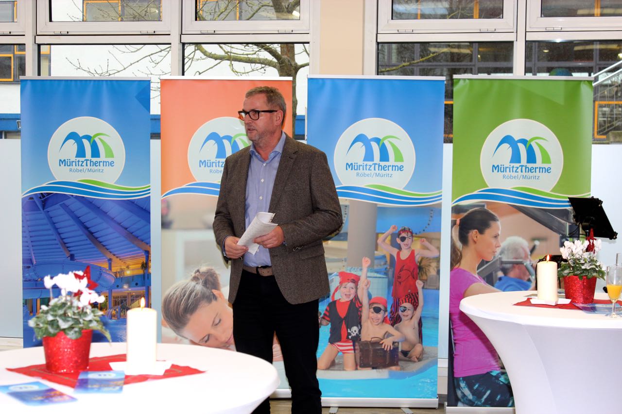 Großer Bahnhof heute in der Müritz Therme in Röbel: Die ist nämlich 20 Jahre alt geworden und hat in den beiden Jahrzehnten so einiges erlebt. Davon berichteten heute neben Bürgermeister Andreas Sprick auch das Ex-Stadtoberhaupt Heiner Müller Ex-Bürgermeister, Stadtpräsident Hans-Dieter Richter und natürlich Geschäftsführer Marco Lüders.