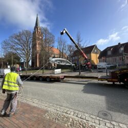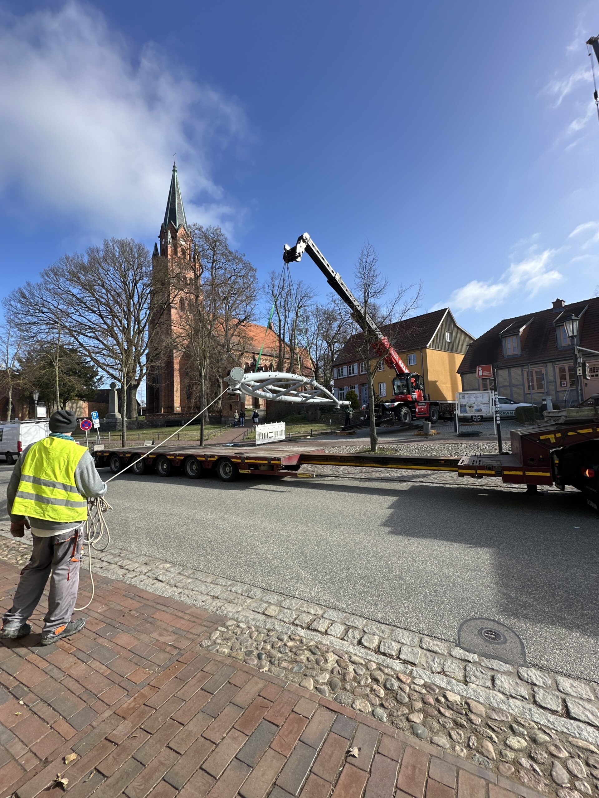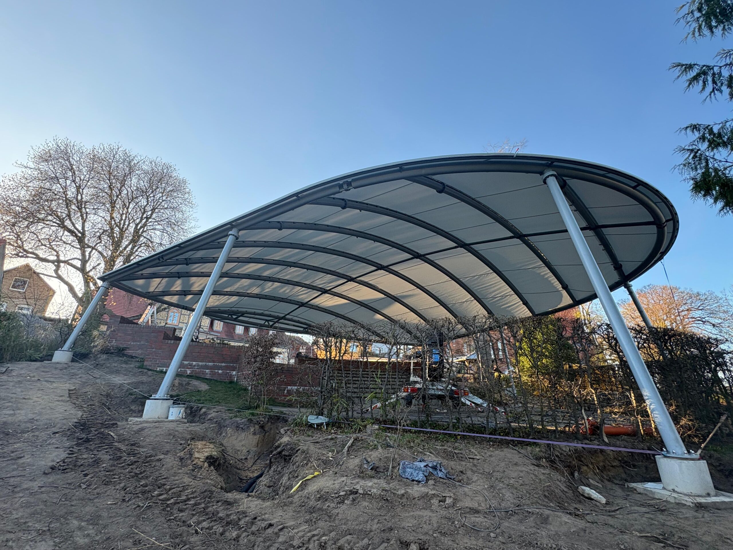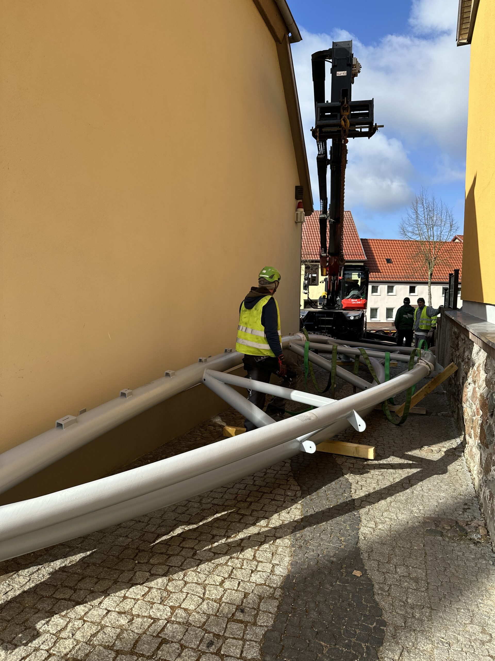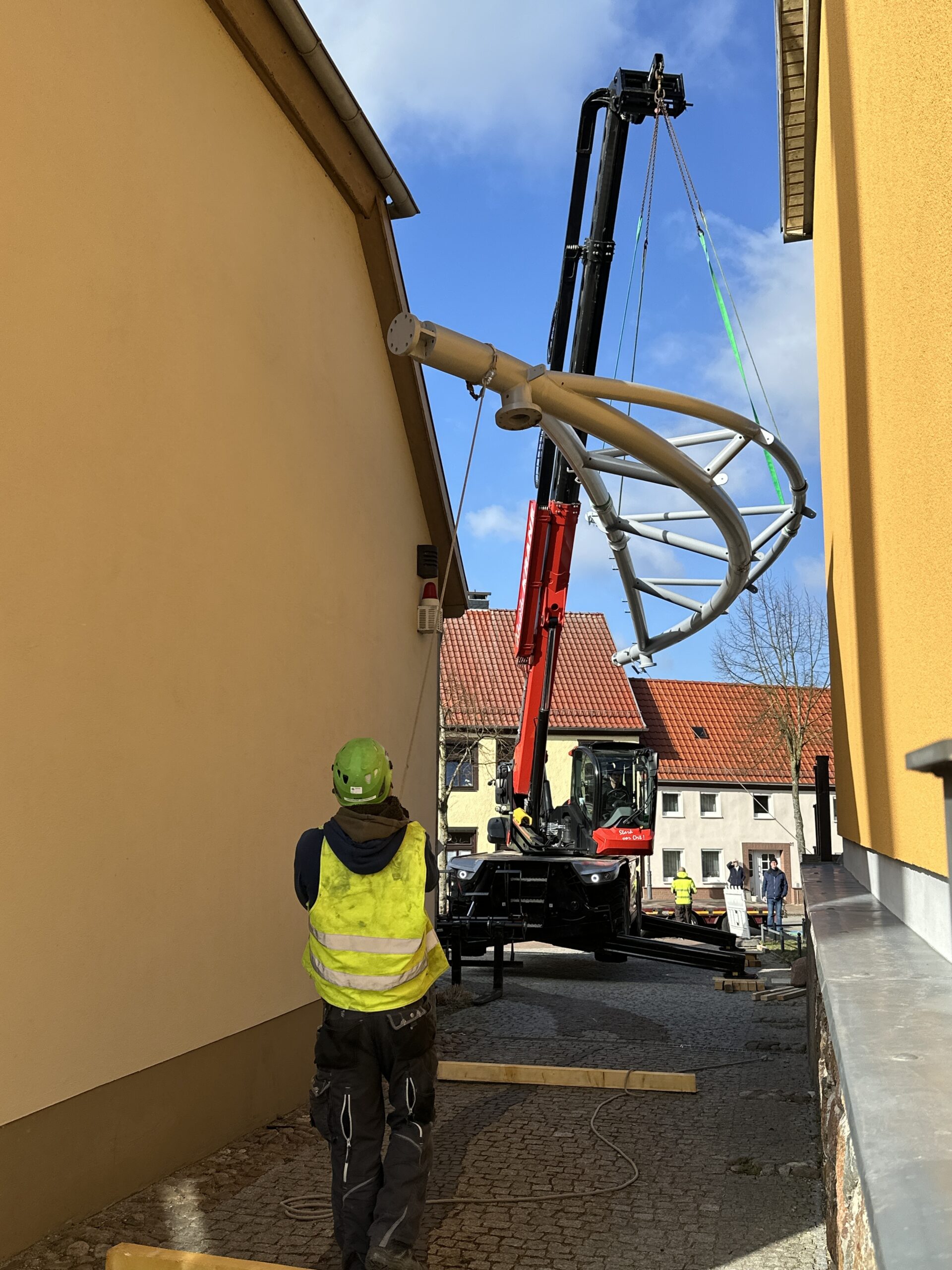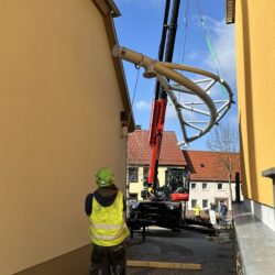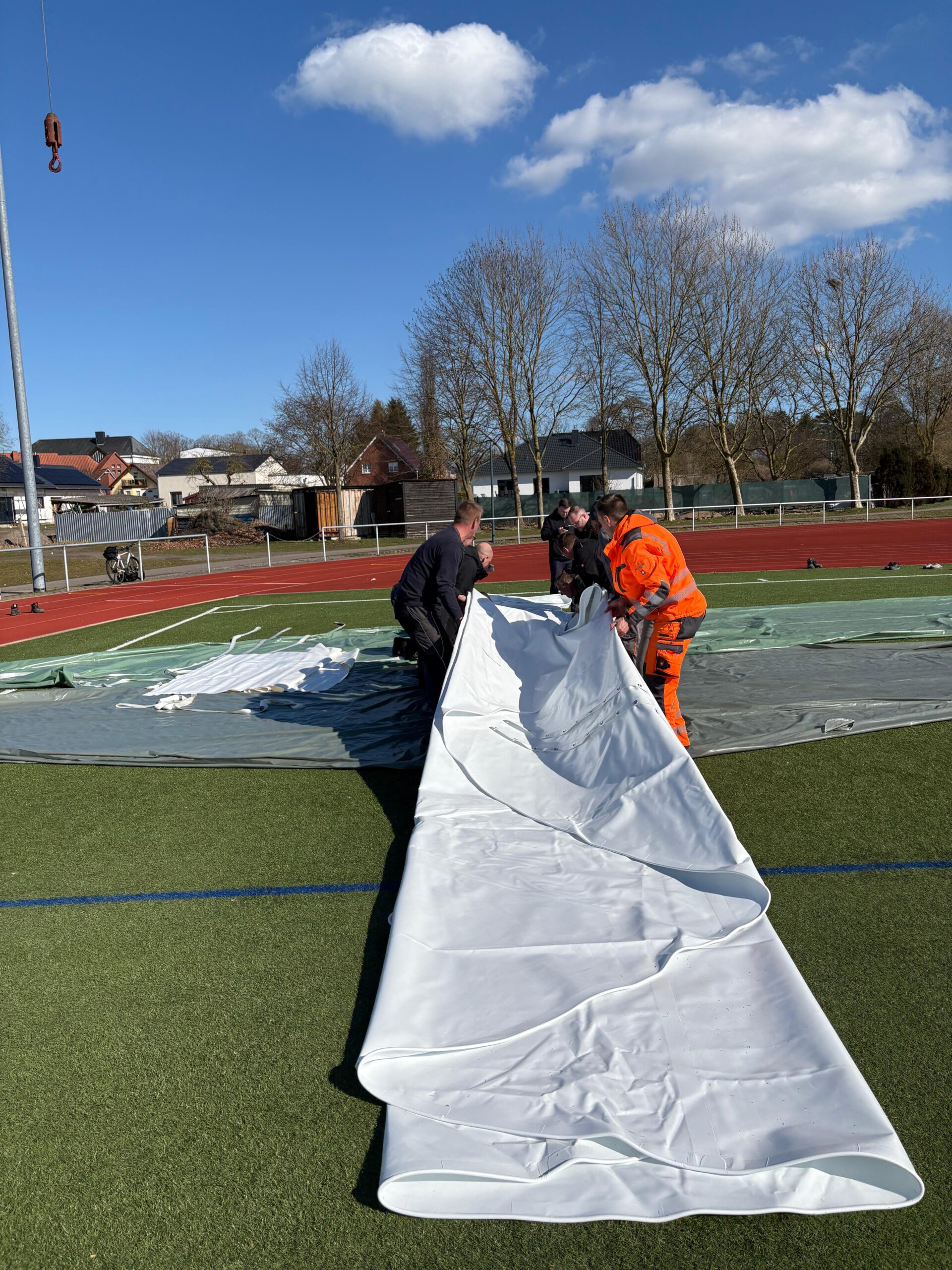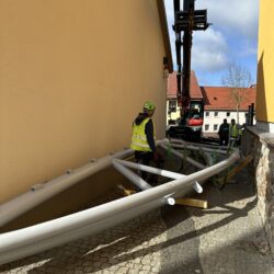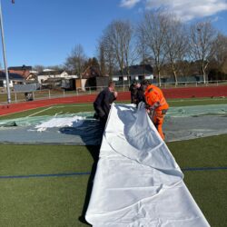 „Wir können den ambitionierten Zeitplan halten, weil unsere heimischen Firmen wirklich Hand in Hand arbeiten, sich gut miteinander abstimmen und Probleme, die wie überall einmal auftreten, ganz unkonventionell gelöst werden“, berichtet der Stadtsprecher. So wurde beispielsweise die Membran – die etwa viermal so fest wie Lkw-Plane ist – verkehrt herum aufgewickelt angeliefert. Die Firmen-Mitarbeiter überlegten kurz, packten sie auf den Lkw, fuhren zum Sportplatz und wickelten sie dort richtig herum auf, um den Aufbau im Bürgergarten zu erleichtern. So geht Zusammenarbeit.