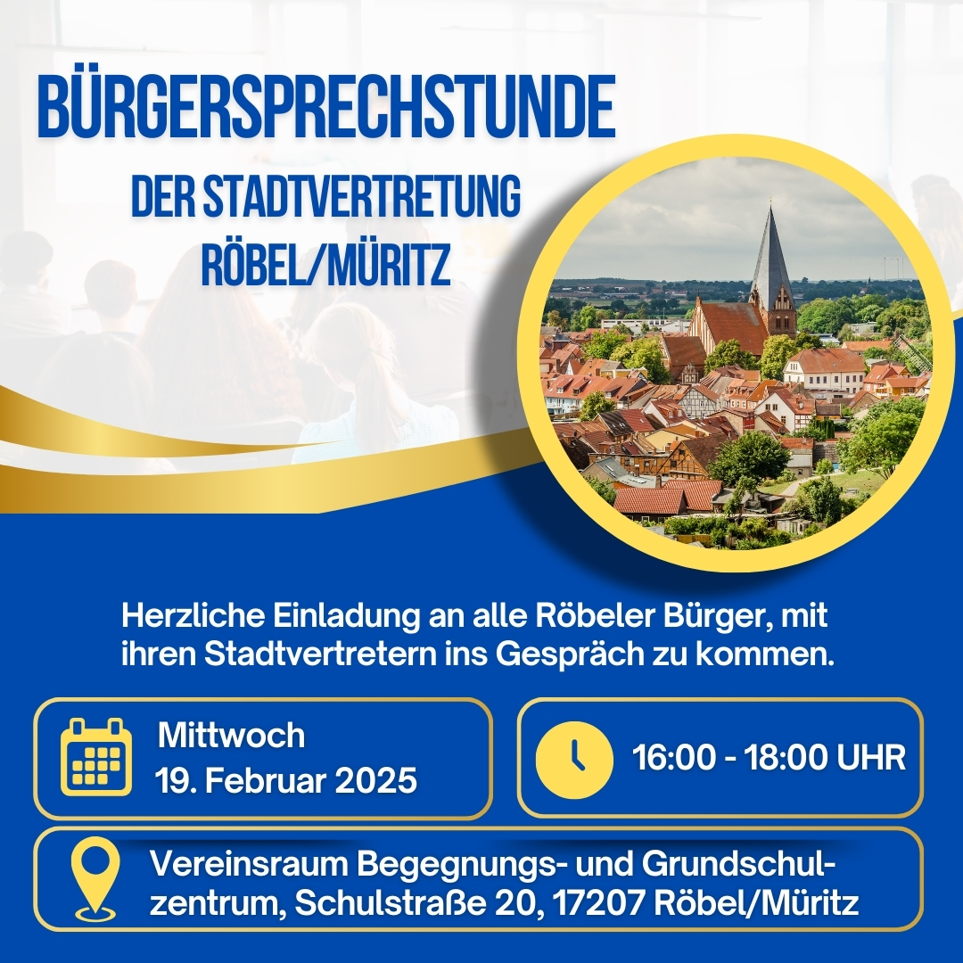 Viele Dinge lassen sich einfach besser besprechen, wenn man sich gegenüber sitzt und in die Augen schaut. Deshalb laden die Röbeler Stadtvertreter und das Stadtpräsidium heute von 16 bis 18 Uhr zur Bürgersprechstunde in den Vereinsraum des Begegnungs- und Grundschulzentrums, Schulstraße 20, ein. „Diese Sprechstunde ist die beste Gelegenheit, sich aktiv an der Entwicklung unserer wunderschönen Stadt zu beteiligen und Ihre Anliegen, Ideen und Wünsche direkt mit uns zu besprechen. Ihre Meinung ist uns wichtig, und gemeinsam können wir Lösungen finden, die Röbel/Müritz noch lebenswerter machen“, heißt es in der Einladung.