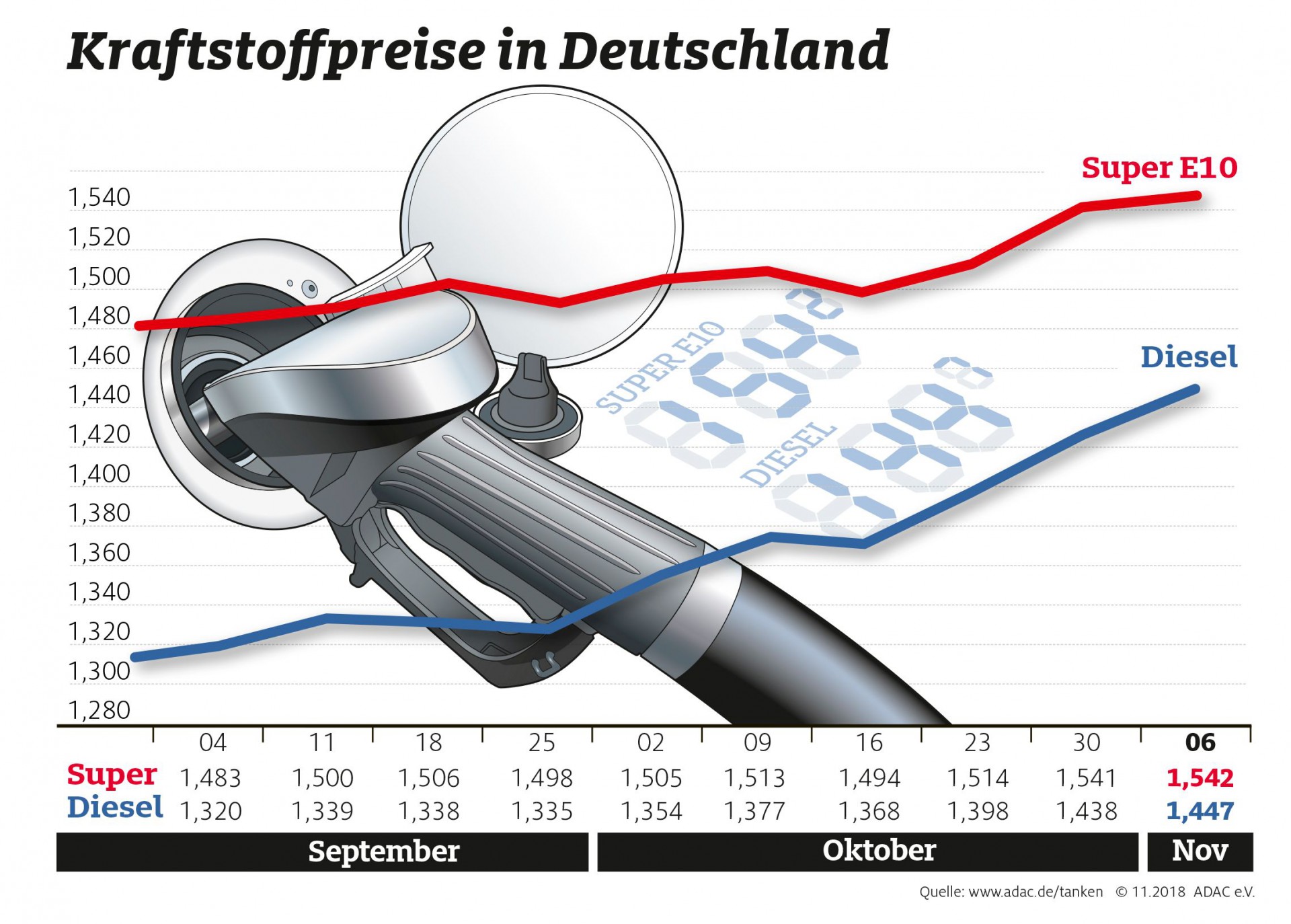 Die seit Anfang Oktober um rund 13 Dollar je Barrel gefallenen Rohöl-Notierungen zeigen an den Tankstellen weiterhin keine Wirkung. Ein Barrel der Sorte Brent verbilligte sich gegenüber der Vorwoche noch einmal um gut 3 auf rund 73 Dollar. Die Preisentwicklung an den Tankstellen lässt sich auch durch das anhaltende Niedrigwasser an Rhein und Main, das den Transport von Öl und Kraftstoffen erschwert und verteuert, nicht überzeugend begründen. Die bundesweite Preisgestaltung an den Zapfsäulen ist daher deutlich überzogen.