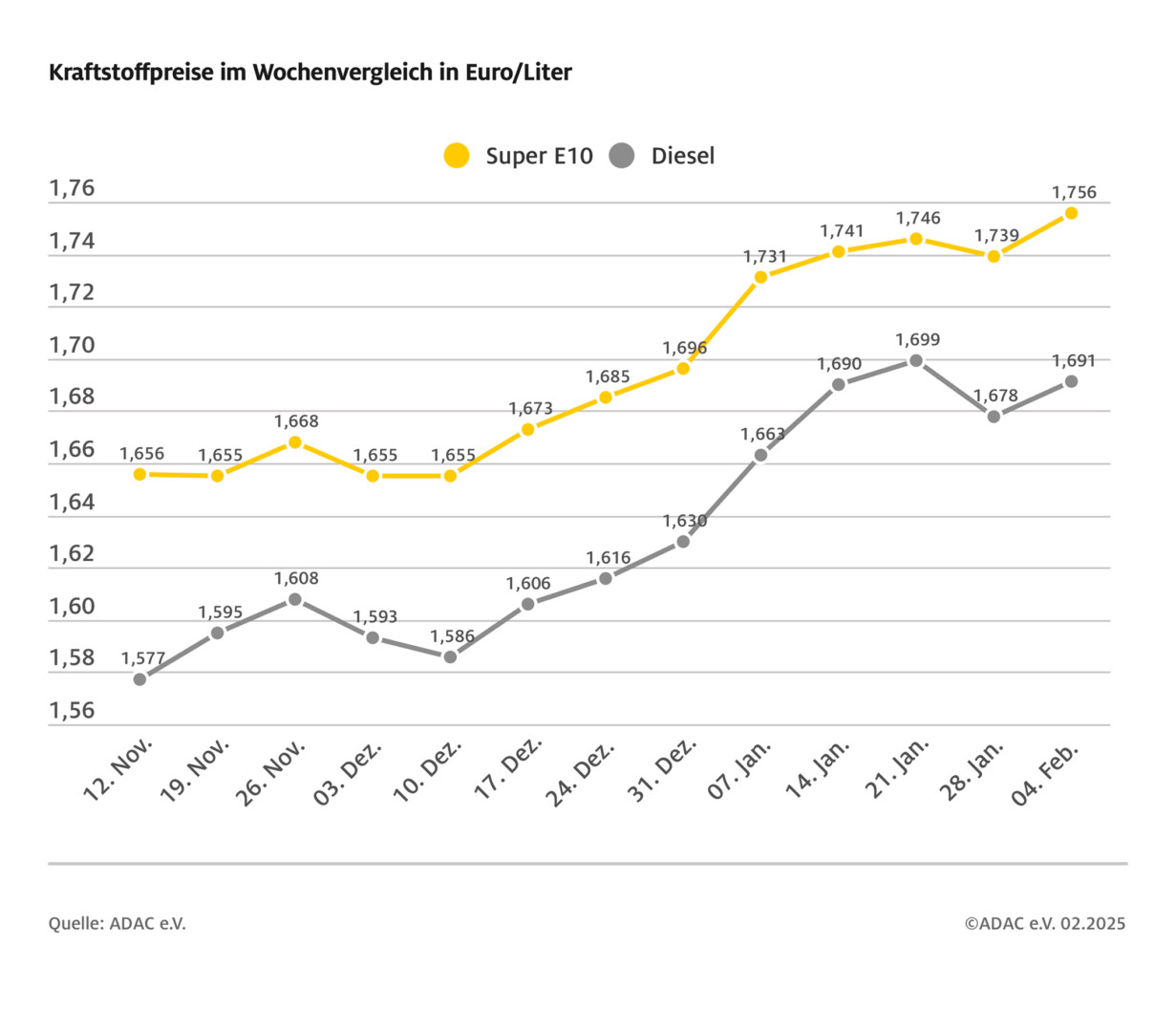 Die Entspannung an den Zapfsäulen der deutschen Tankstellen in der vergangenen Woche war nur von kurzer Dauer. Sowohl Benzin als auch Diesel sind im Vergleich zur Vorwoche teurer geworden, obwohl der Rohölpreis weiter gesunken ist. Laut aktueller ADAC Auswertung der Kraftstoffpreise in Deutschland kostet ein Liter Super E10 im bundesweiten Mittel 1,756 und damit nicht nur 1,7 Cent mehr als vor Wochenfrist, sondern auch so viel wie seit Anfang August 2024 nicht mehr. Für Diesel müssen Autofahrer aktuell im Schnitt 1,691 Euro bezahlen – ein Plus von 1,3 Cent gegenüber der Vorwoche.