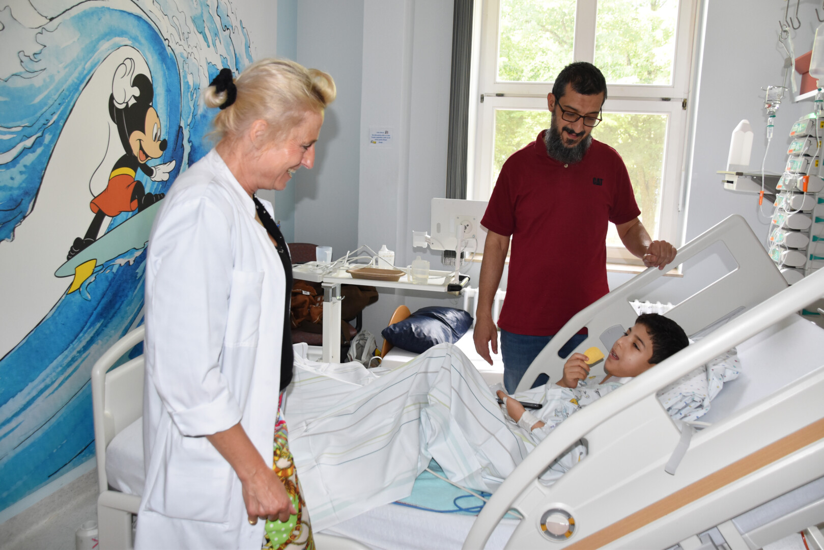 Bild: Prof. Dr. Stefanie Märzheuser ermutigt Omar, nach der großen Darmoperation wieder zu essen.