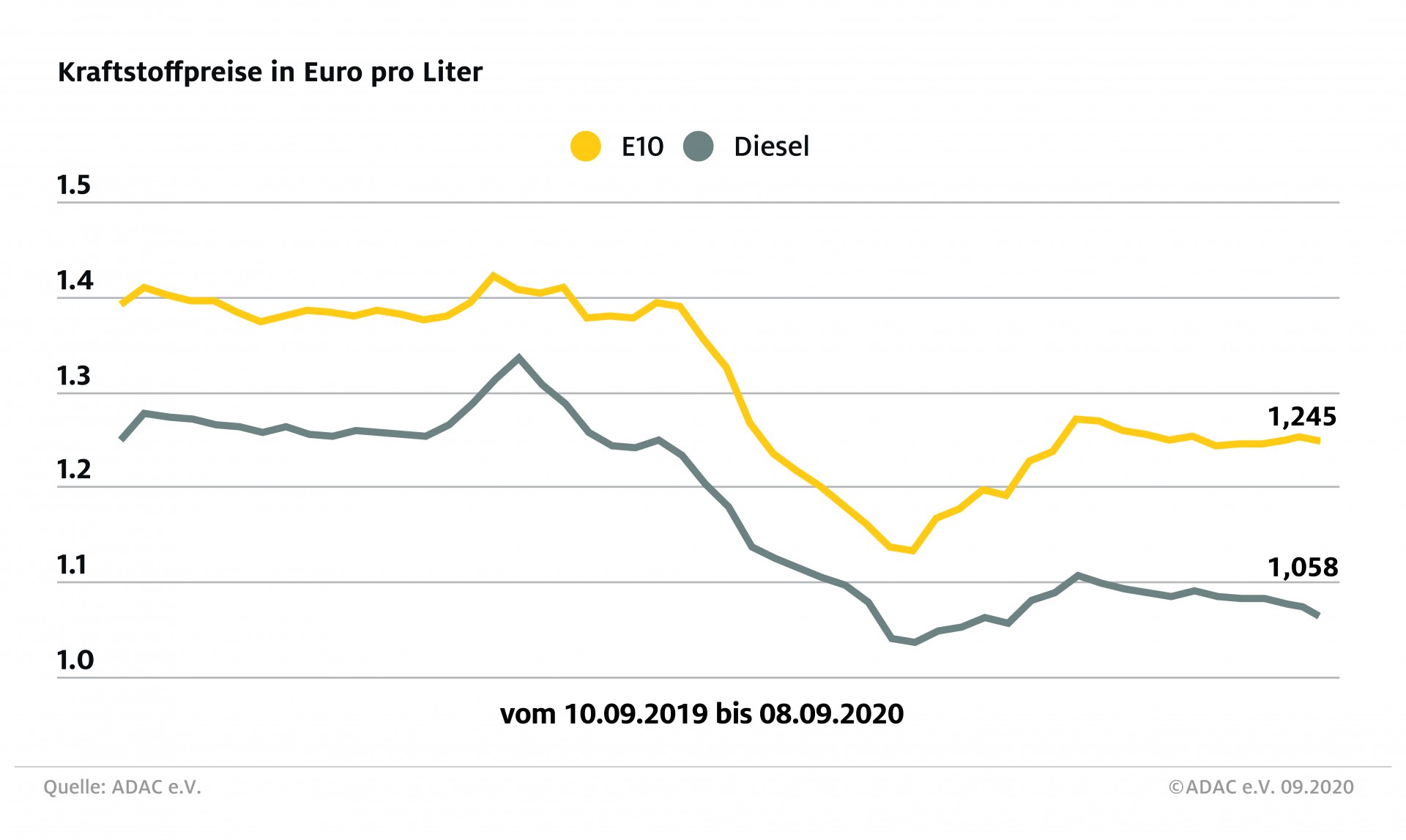 Die Kraftstoffpreise sind im Wochenvergleich zurückgegangen. Für Super E10 verzeichnet der ADAC einen Rückgang von 0,9 Cent. Ein Liter kostet im Bundesschnitt 1,245 Euro. Beim Diesel ist ein noch stärkerer Preisrückgang zu verzeichnen. Hier sinkt der Preis für einen Liter um 1,4 Cent auf 1,058 Euro.