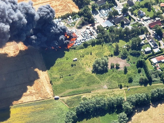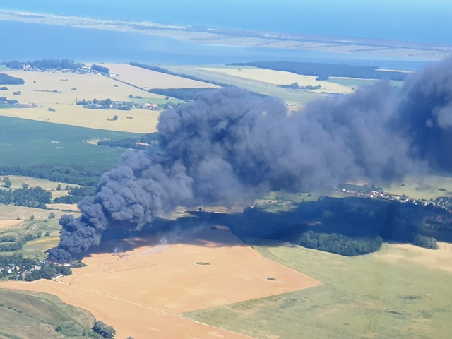 Es brannten etwa 400 aufgestapelte Fahrzeugwracks auf einer Fläche von etwa 200 x 200 Metern. Diese waren frei von Betriebsstoffen. Dennoch stieg eine schwarze Rauchwolke hoch und war sogar von der Insel Rügen aus zu sehen. Ein angrenzendes Feld konnte durch die Feuerwehren schnell gelöscht und ein Ausbreiten des Brandes verhindert werden.