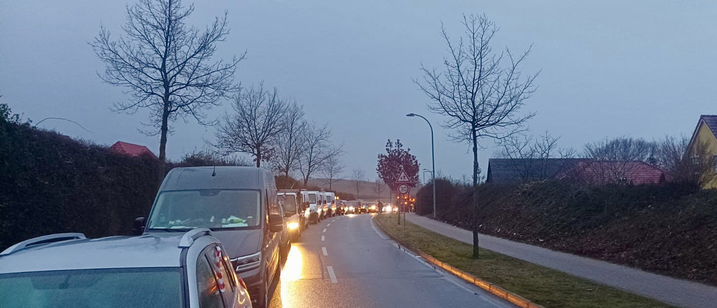 Der Autokorso von Waren nach Neubrandenburg setzt sich in wenigen Minuten in Bewegung. In der Stadt selbst gibt es derzeit keine Verkehrsbehinderungen. Rund 70 Fahrzeuge machen sich dann auf den Weg – Transporter, Traktoren sowie Privatleute und Pflegedienste. In Möllenhagen und Penzlin wollen sich weitere Teilnehmer anschließen. Neubrandenburg wird aus mehreren Städten angesteuert, kurz vor Mittag gibt’s dort auf dem Markt dann eine Kundgebung.