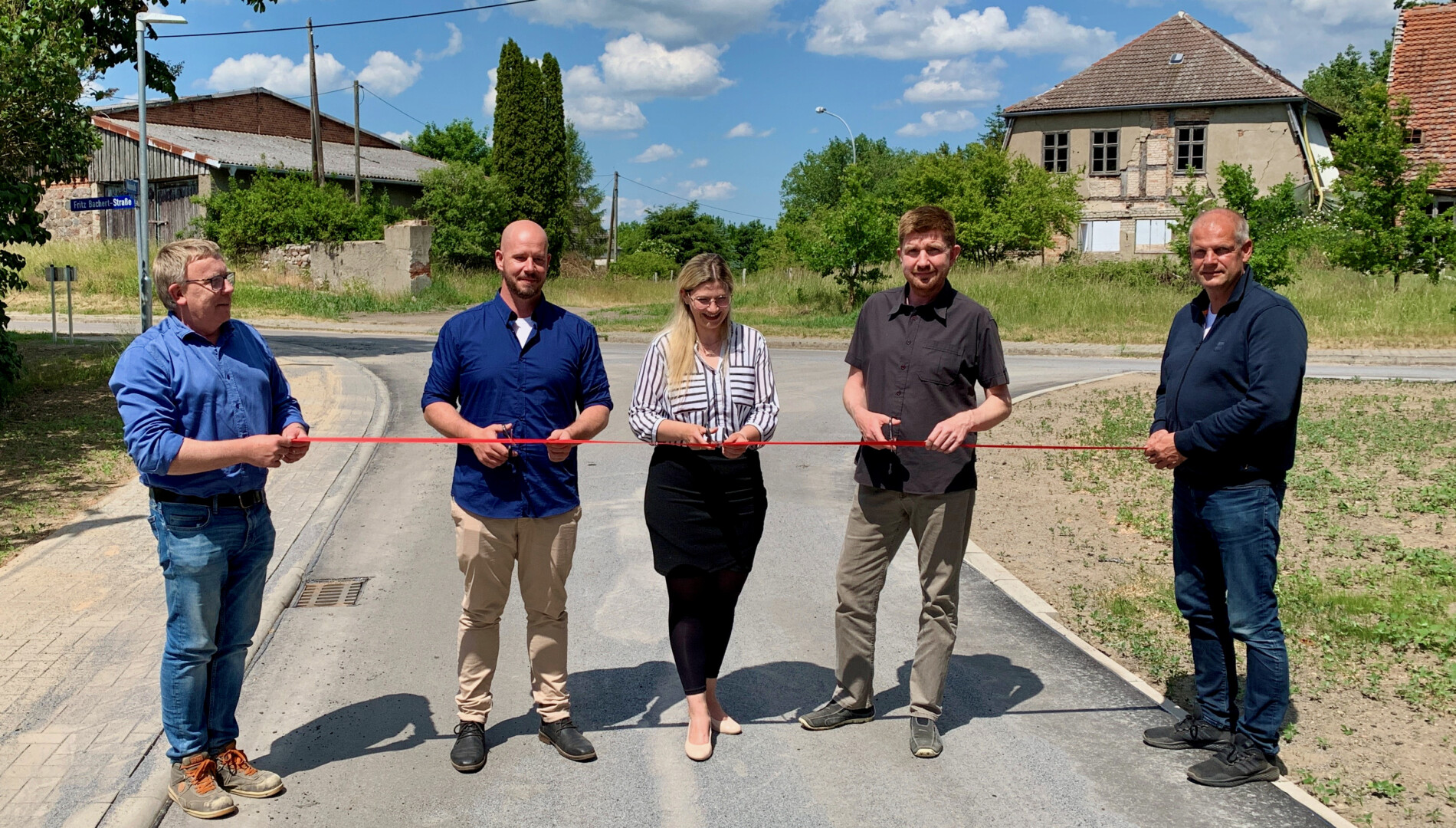 Bild oben: Symbolische Verkehrsfreigabe durch (v.l.): Jan Umlauft (Ingenieurbüro Umlauft), Christoph Tamm (Technischer Leiter Abwasserverband), Anna Enenkel (Bauamtsleiterin Friedland), Hajo Schütt (Sachgebietsleiter Tiefbau LK MSE) und Michael Bahmann (FGW Bau).