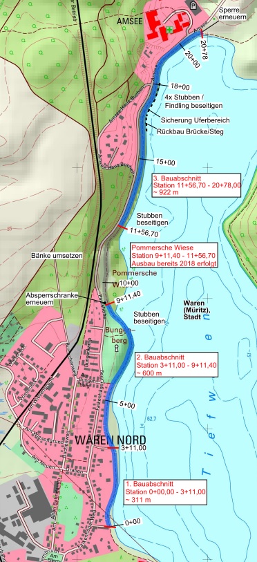 Eigentlich sollten die Arbeiten schon Ende vergangenen Jahres beginnen, in wenigen Tagen gehen sie nun wirklich los: Die Sanierungsarbeiten des Rad- und Wanderweges am Westufer des Tiefwarensees starten einer Mitteilung der Stadt zufolge am 8. April. Der Geh- und Radweg wird auf einer Länge von gut 1,8 Kilometern ab Höhe Falkenhäger Weg 20 bis zum Hotel Amsee saniert. Im Vorab sind bereits zahlreiche Bäume entlang der Wegetrassen gepflanzt worden.