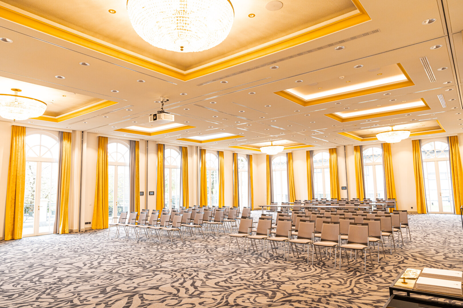 Im Rahmen der Umgestaltung wurde das florale Design des angrenzenden Restaurants Orangerie bewusst aufgegriffen und in den Banketträumlichkeiten weitergeführt: So zieren etwa die Foyers eine verspielte Tapete mit filigranen Kirschblütenzweigen. Goldene Farbakzente schaffen ein freundliches und zugleich elegantes Ambiente. Bestehende Möbel wurden neu aufgearbeitet und harmonisch in das Gesamtkonzept integriert.
