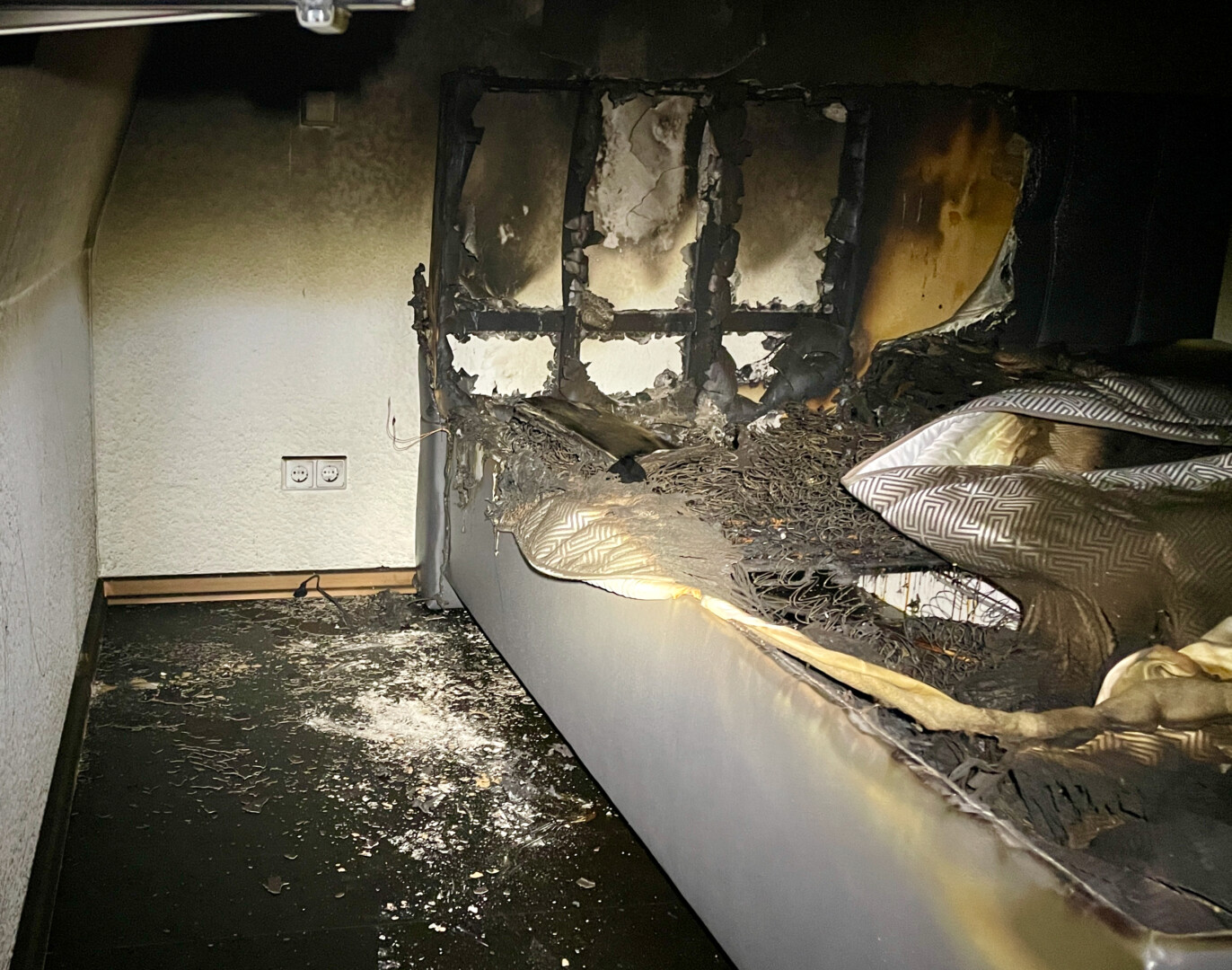 Auslöser des Brandes war vermutlich ein ipad an einer Ladestation. Der Raum, in dem es lag, ist verqualmt und zerstört, nach den Löscharbeiten komplett schwarz. Der gefährliche Qualm zog auch in andere Räume, so dass der entstandene Schaden beträchtlich sein dürfte.