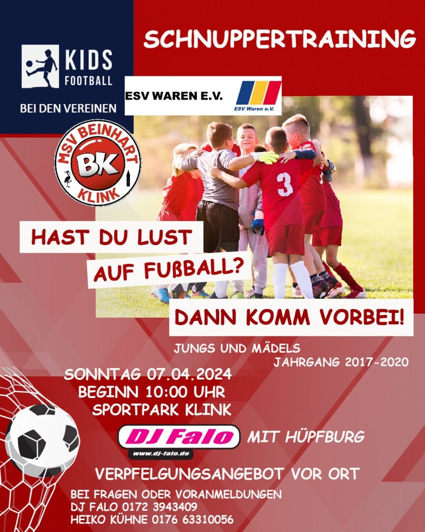 Schnuppertraining für Jungs und Mädels auf dem neuen Kunstrasenplatz in Klink: Am kommenden Sonntag, 7. April, laden der MSV Beinhart Klink und Olaf Gaulke als Trainer des ESV Waren ab 10 Uhr zu einem Kennenlernen ein. Die beiden Vereine machen gemeinsame Sache und möchten den Kinder- und Jugendfußball in den kommenden Jahren wieder stärken. Interessierte Kinder der Jahrgänge 2017-2020 (aber auch gerne ältere Kinder) sind herzlich willkommen. Natürlich gibt’s nebenher auch Gelegenheit, um ein bisschen umher zu toben.