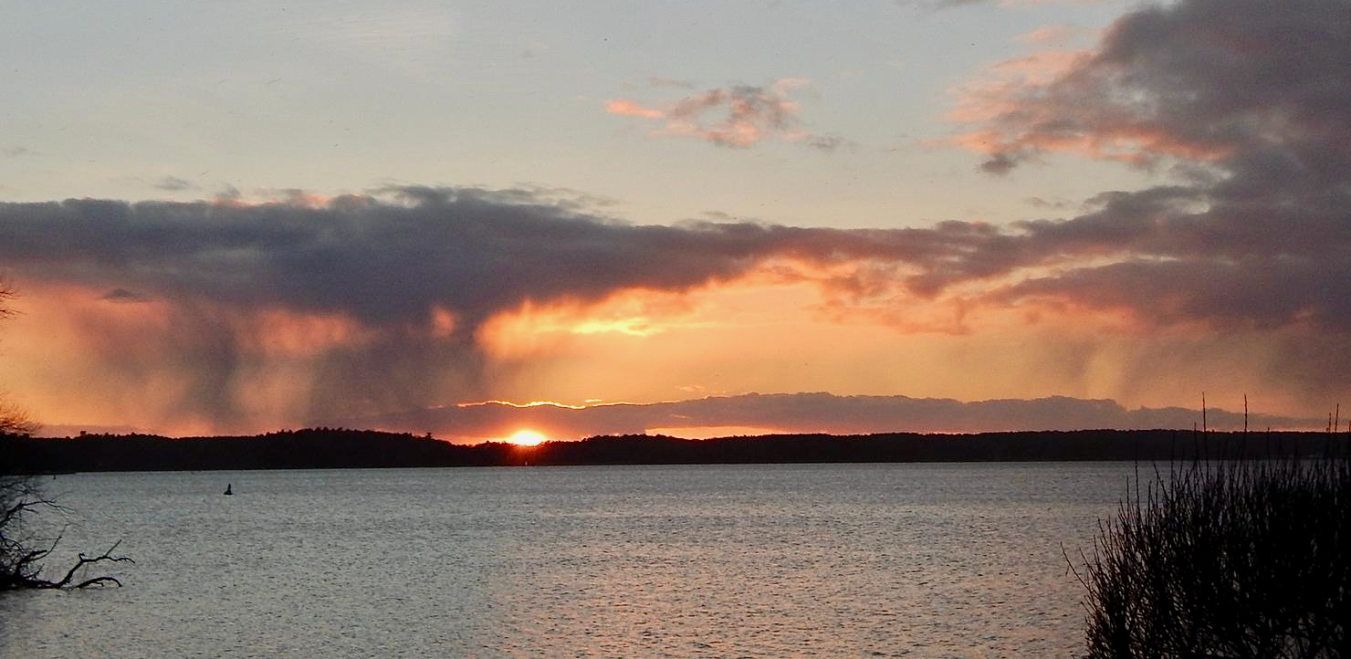 Schneegestöber und Sonnenschein gleichzeitig heute Abend über der Müritz.
