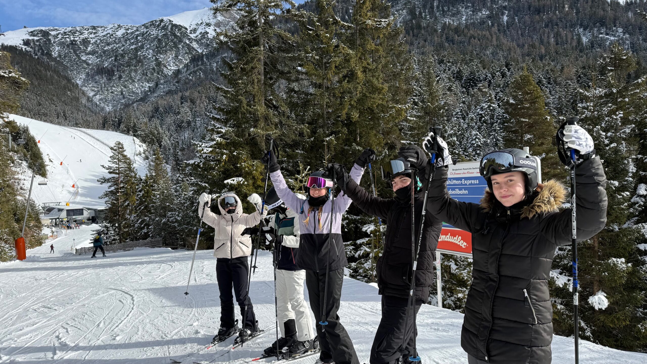 So wurden immer längere und steilere Hänge bezwungen und die Technik des Parallelschwungs erlernt. Ein Höhepunkt am letzten Tag war natürlich die Eroberung des Seefelder Joch mit einem gigantischen Ausblick auf das Karwendelgebirge und die Zugspitze. Schon die Gondelfahrt bis auf 2064m war für alle Schüler ein außergewöhnliches Erlebnis. Zwei Skilehrer „stürzten“ sich dann unter großem Anfeuerungsjubel der Schüler die steilste „schwarze Piste“ des Skigebietes hinunter.