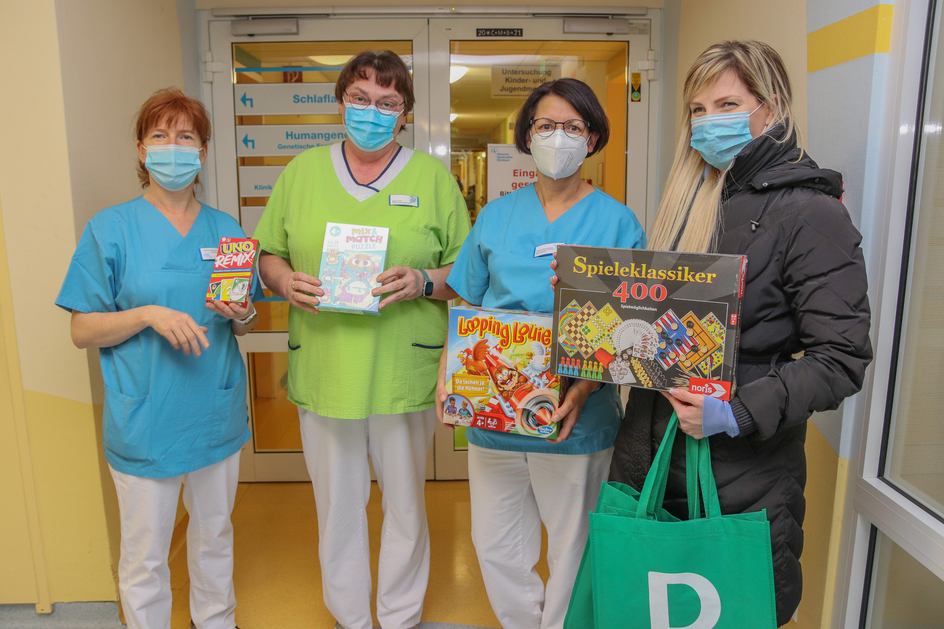 Bild: Karola Grimpe (von rechts) übergab die Spiele an Claudia Baumbach von der Station K11, Erzieherin Silvia Rink und Bereichspflegedienstleiterin Ines Schwemer.