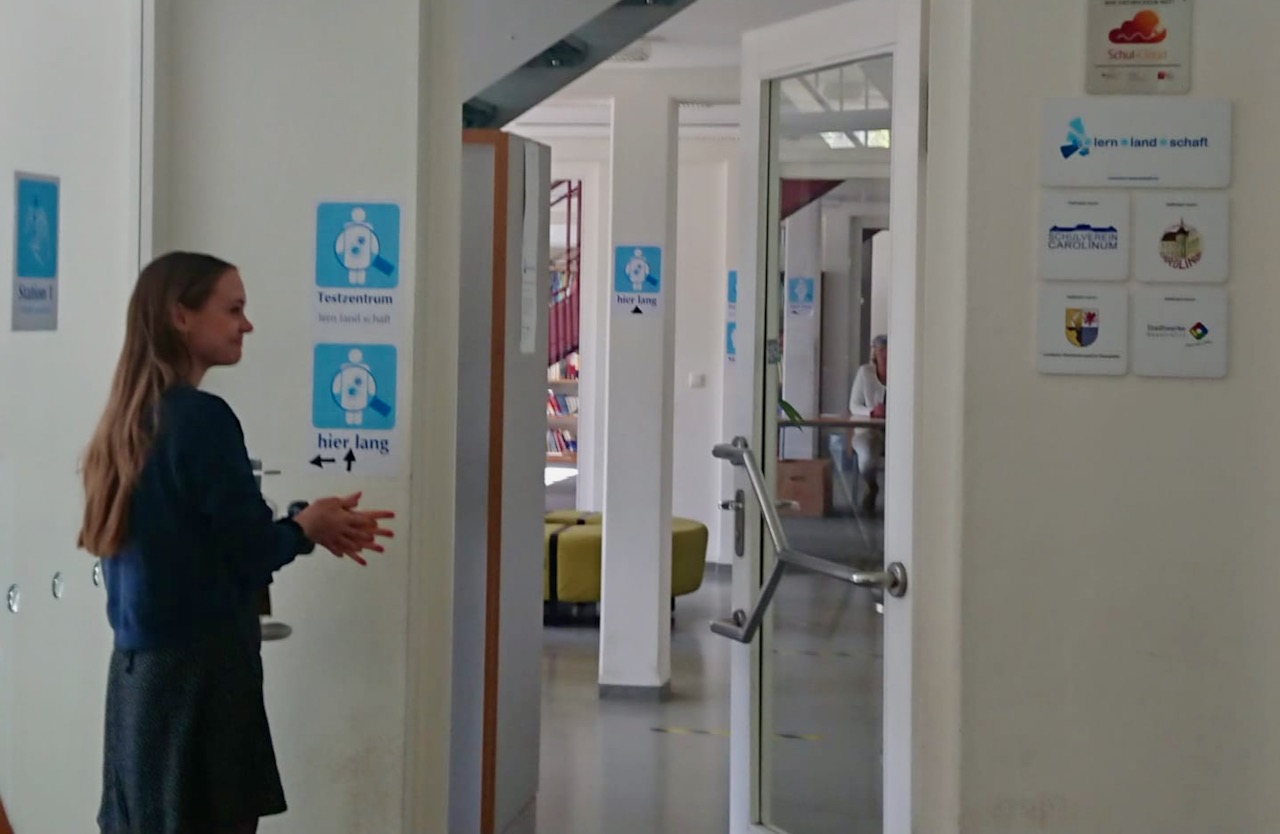 Aber wenn die Temperaturen draußen zu niedrig sind, dient ein Lernlandschafts-Raum gleich hinter dem Eingang als Testlabor. Schüler müssen sich bei Betreten der Schule registrieren lassen, die Hände desinfizieren und bekommen dann – noch verpackt – die Abstrichstäbchen. Damit nehmen sie vor einem Spiegel selbst den Rachentest vor.