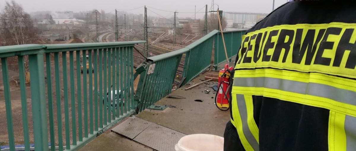 Das Geländer hat zum Glück gehalten, Teile des Wagens sind nach unten gestürzt.