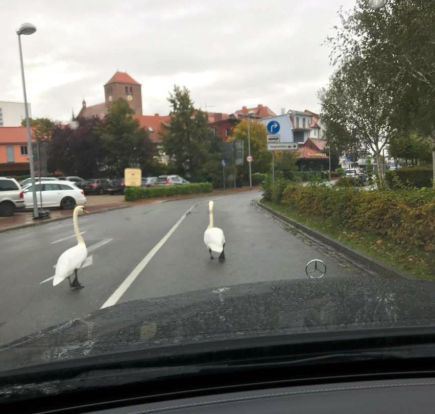 Achtung, die Warener Schwäne sind wieder unterwegs und nutzen gerne gleich mal beide Fahrspuren. Wahrscheinlich waren sie gerade mal kurz im Müritzeum, um zum 10. Geburtstag zu gratulieren.