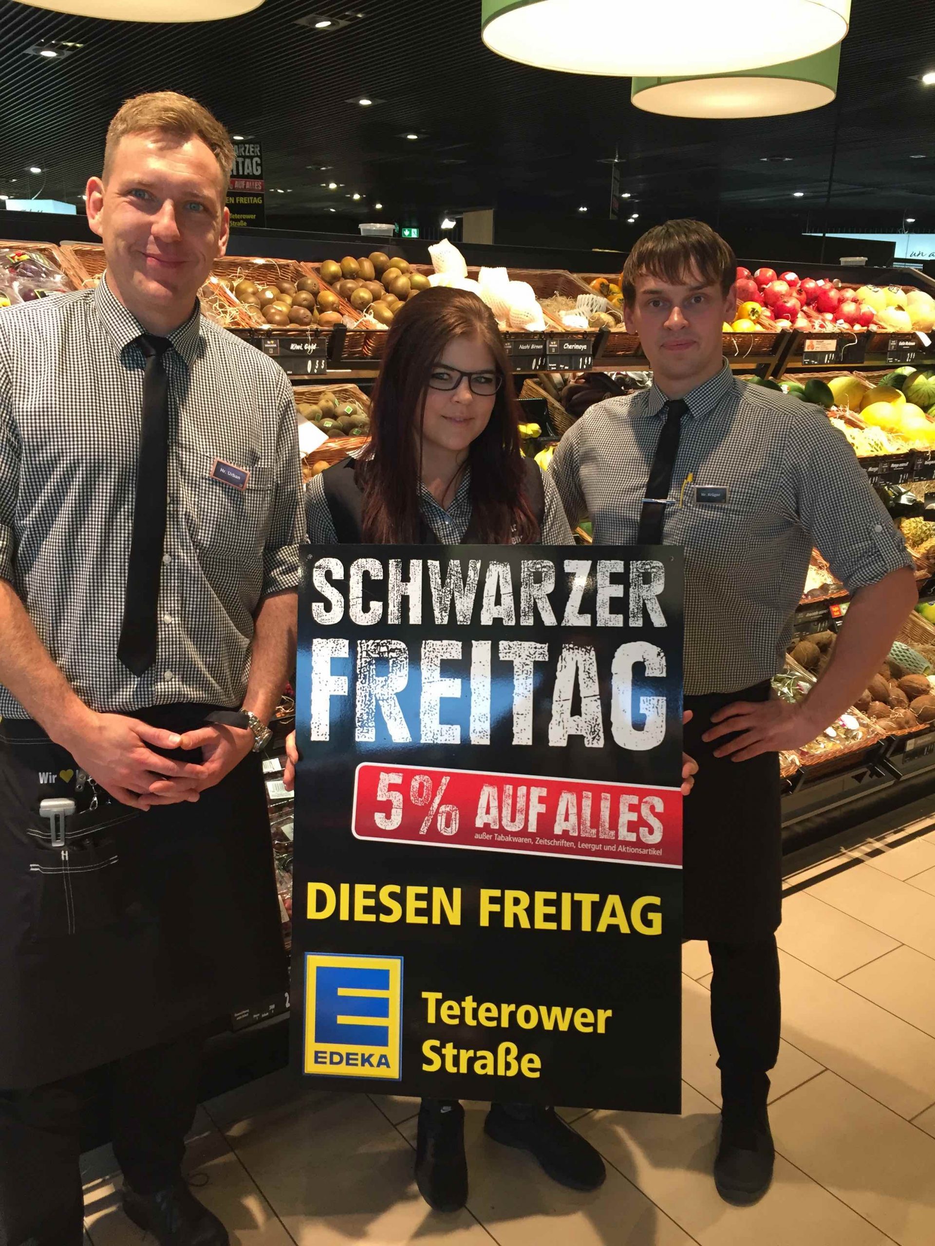 (Reklame) Am 24. November heißt es im EDEKA Markt in der Teterower Straße wieder „Schwarzer Freitag“. Die Kunden können sich zum zweiten Mal innerhalb weniger Wochen auf fünf Prozent Rabatt freuen (außer Tabakwaren, Leergut, Zeitschriften und Aktionsartikel).