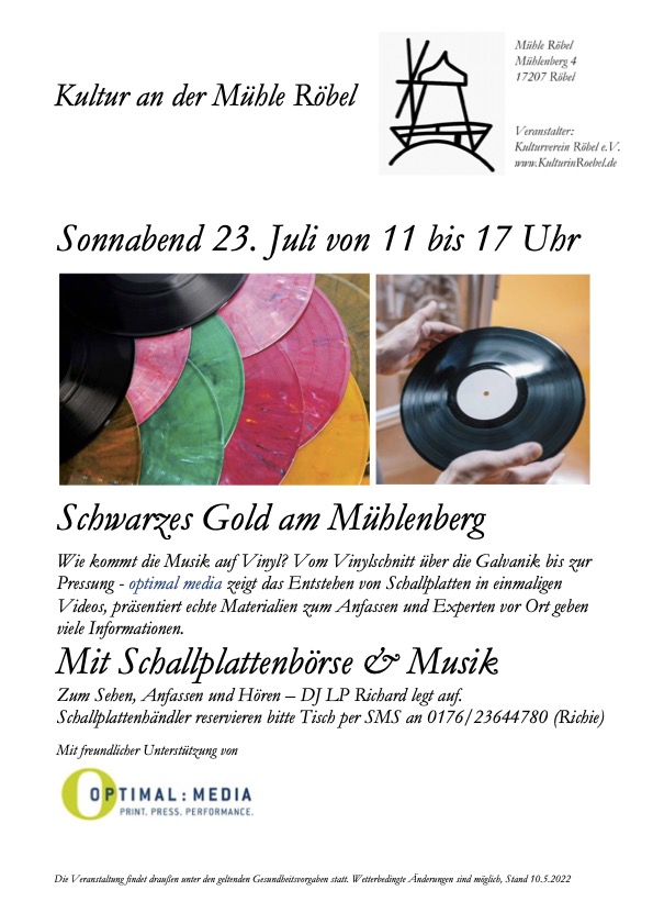 Das Event fand erstmals im August 2021 open air statt: Von nah und fern reisten Schallplattenfans und Musikbegeisterte, aber auch Goldgräber, die die Fertigung vom „Schwarzen Gold“ kennenlernen wollten, nach Röbel. Das Abenteuer wird auch 2022 möglich, dank der Unterstützung von optimal media und dem Einsatz zahlreicher Ehrenamtlicher im Kulturverein Röbel e.V.