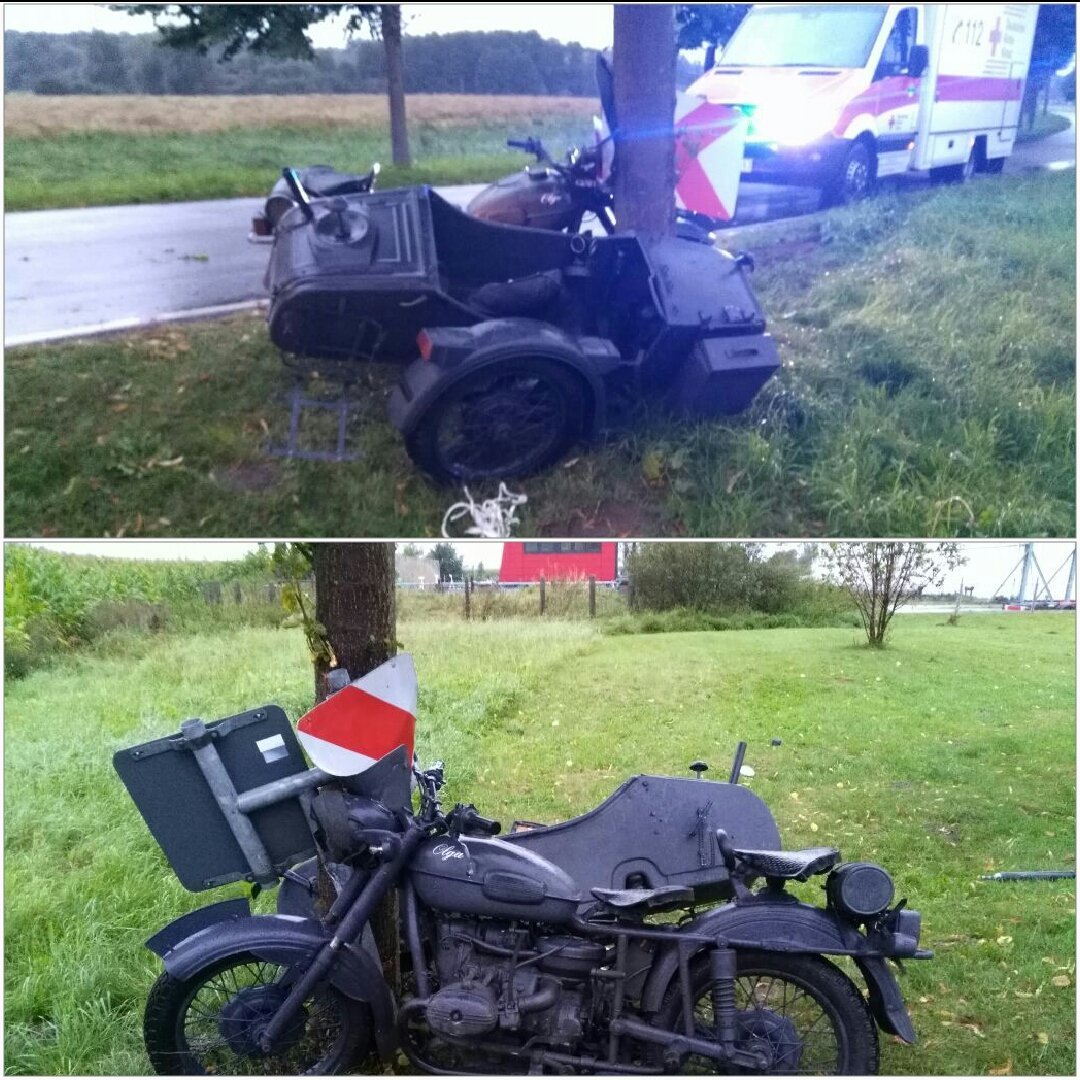 Er war nicht nur betrunken, sondern auch schwer verletzt und ist trotzdem vor der Polizei geflüchtet: Ein 49 Jahre alter Fahrer eines Motorrades der Marke Ural mit Beiwagen kam gestern Abend zwischen Zierzow und Sietow Dorf in einer langgezogenen Rechtskurve nach links von der Straße ab und krachte gegen einen Baum sowie zwei Verkehrsschilder.