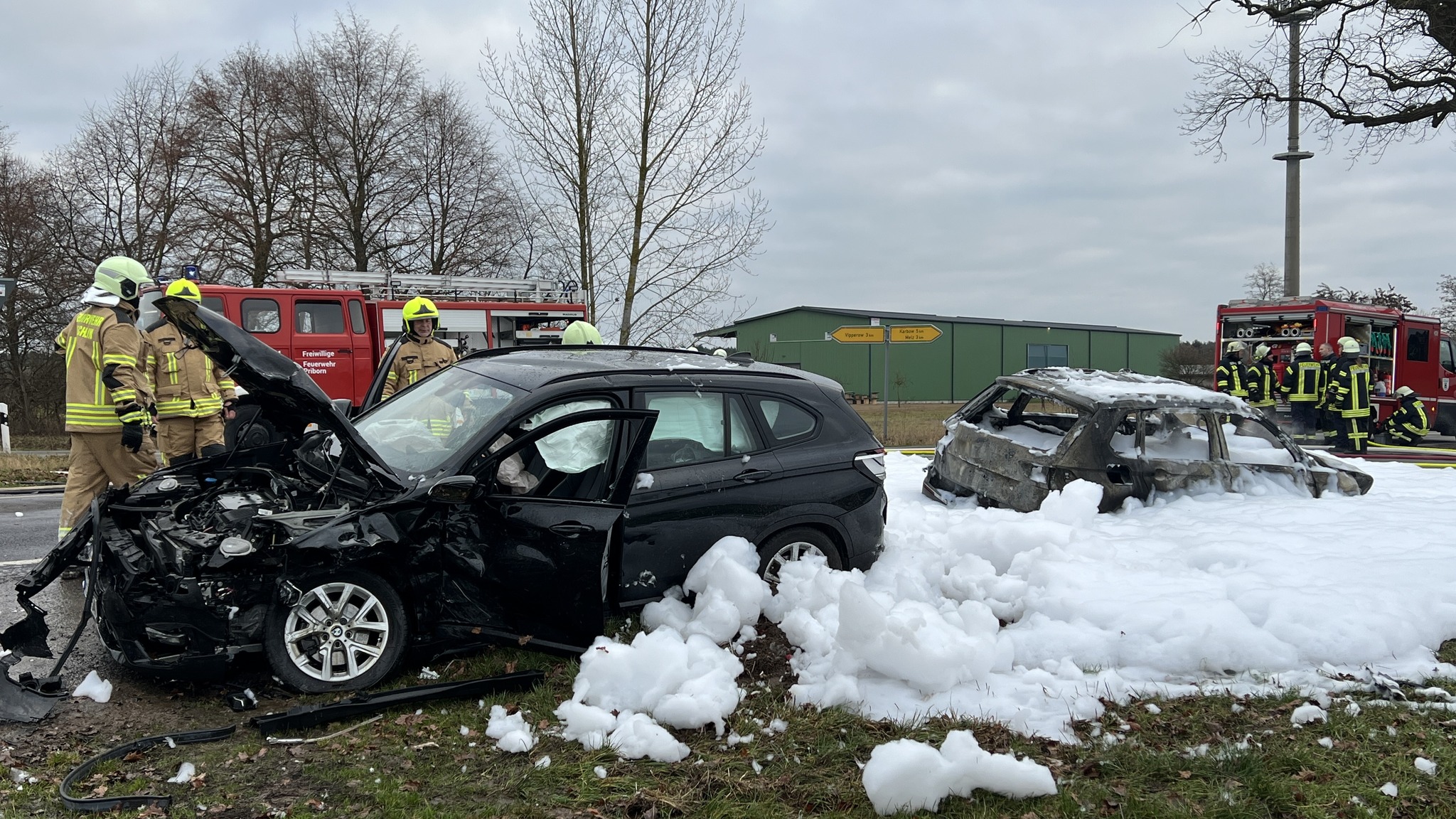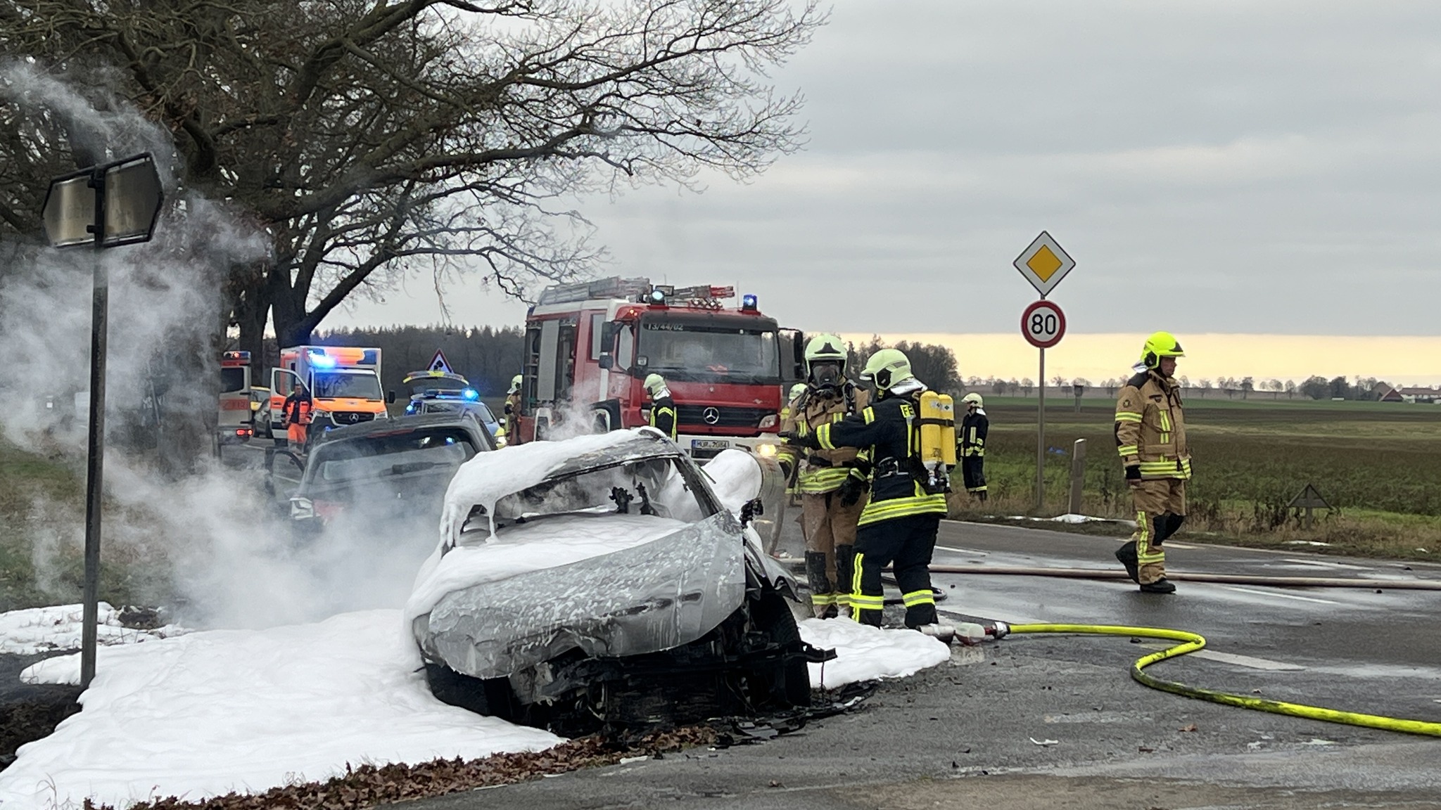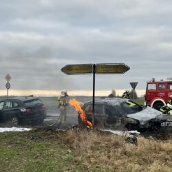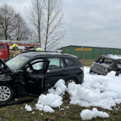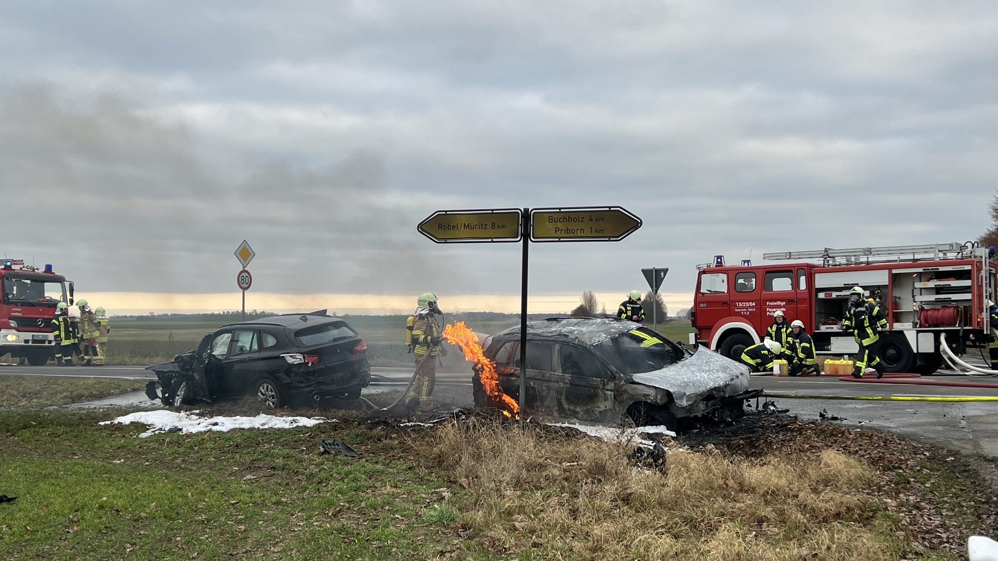 Bei einem Unfall in der Nähe von Priborn sind heute Vormittag drei Menschen verletzt worden, eine Frau davon schwer. Nach aktuellem Stand ist aus bislang ungeklärter Ursache ein 71-jähriger Autofahrer in Fahrtrichtung Röbel in den Gegenverkehr geraten und dabei mit einem anderen Pkw zusammengestoßen. Durch den Unfall wurden der 79-jährige Fahrer des Autos im Gegenverkehr und der 71-jährige mutmaßliche Unfallverursacher verletzt ins Klinikum gebracht. Die 70-jährige Beifahrerin des mutmaßlichen Unfallverursachers kam schwer verletzt mit einem Rettungshubschrauber in eine Klinik. Die Landesstraße ist kurz hinter Priborn in Fahrtrichtung Röbel und Fahrtrichtung Melz derzeit noch gesperrt. Die Strecke von Priborn nach Vipperow ist halbseitig frei. Beide Autos sind Schrott, wobei einer der beiden Pkw durch einen Brand zerstört wurde.