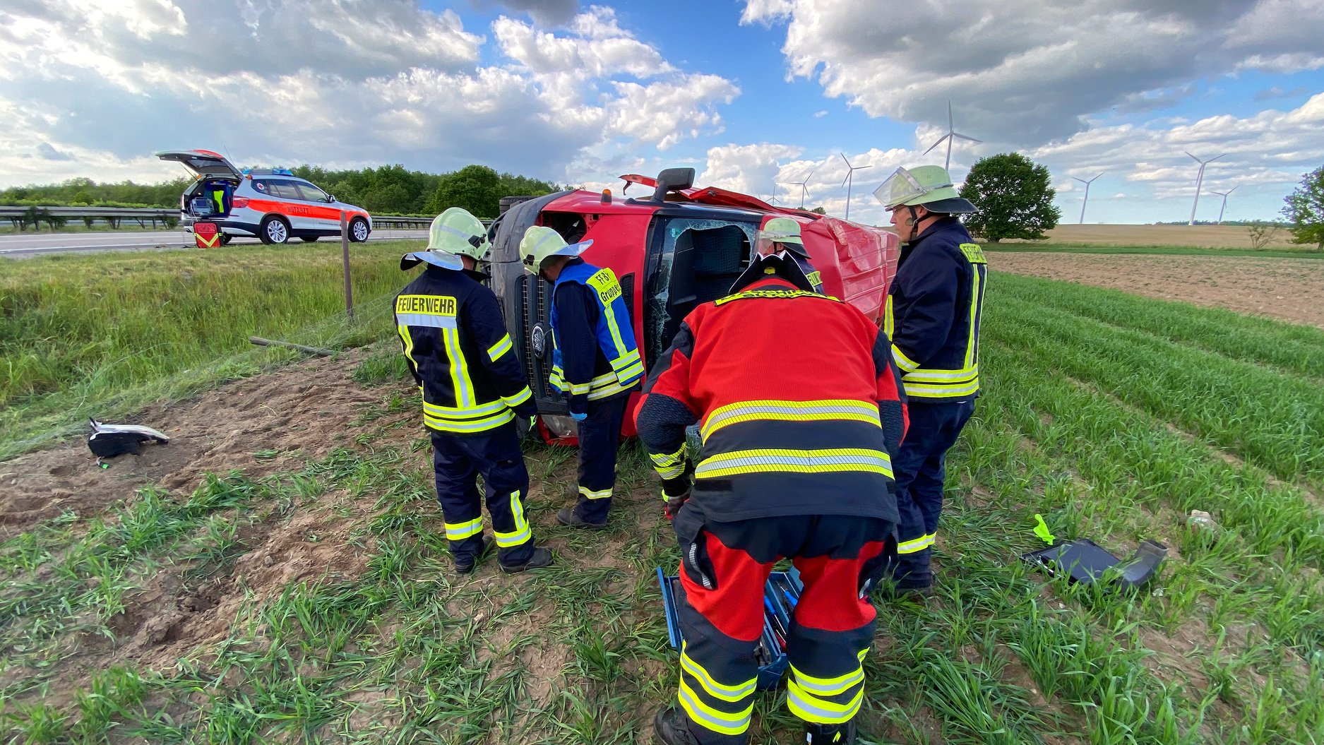 Der Transporter kam daraufhin ins Schleudern, überschlug sich mehrfach und durchbrach daraufhin die Außenleitplanke der Fahrbahn. Der Mann wurde in dem Fahrzeug eingeklemmt und wurde von mehreren Ersthelfern versorgt bis die Rettungskräfte eintrafen.