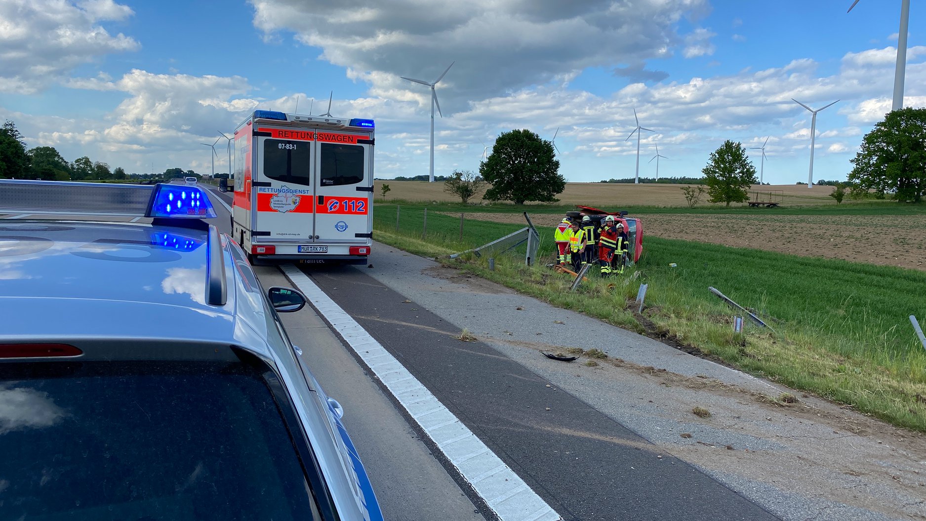 Der Transporter kam daraufhin ins Schleudern, überschlug sich mehrfach und durchbrach daraufhin die Außenleitplanke der Fahrbahn. Der Mann wurde in dem Fahrzeug eingeklemmt und wurde von mehreren Ersthelfern versorgt bis die Rettungskräfte eintrafen.