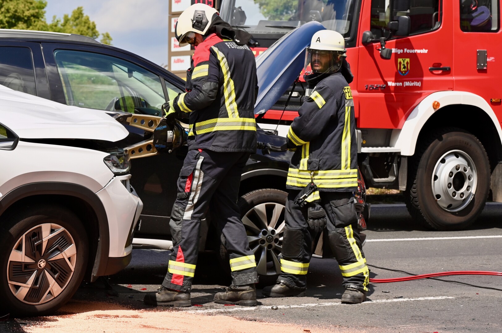 Da Betriebsstoffe von beteiligten Fahrzeugen ausgelaufen waren, kamen auch Kameraden der Warener Feuerwehr mit insgesamt drei Fahrzeugen und 19 Kameraden in den Einsatz. Die Freiwilligen betreuten zudem einige Beteiligte, die geschockt am Radweg saßen. Zwei kleine Kinder, etwa drei und vier Jahre alt, kamen zum Glück mit dem Schrecken davon. Neben den Notfallsanitätern kümmerten sich die Kameraden liebevoll um die Kleinen, sogar eine Besichtigung der Feuerwehrautos war für sie zur Beruhigung drin. Der Gesamtschaden beläuft sich auf geschätzte 50.000 Euro.