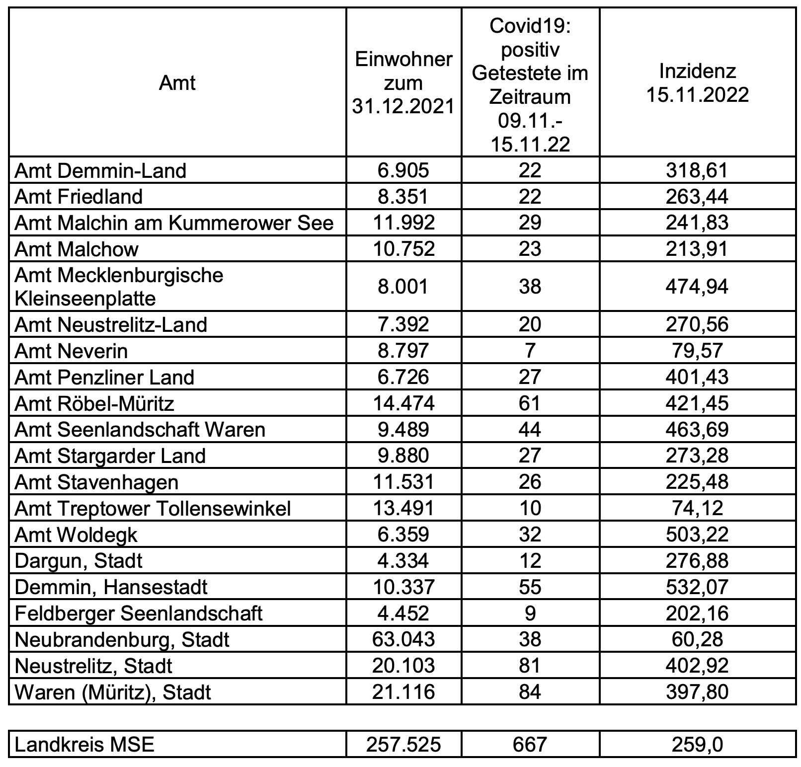 Und hier die aktuellen Corona-Inzidenzen des Landkreises Mecklenburgische Seenplatte – aufgeschlüsselt nach Städten und Ämtern – im Überblick:
