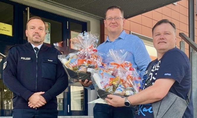Der Neustrelitzer Revierleiter Stefan Neumann empfing einen 35-jährigen Mann aus der Region gemeinsam mit seinem 48-jährigen Arbeitskollegen im Hauptrevier Neustrelitz. Die beiden Männer haben am Nachmittag des 24. März auf dem Parkplatz eines Getränkeladens in der Mirower Chaussee in Wesenberg drei auffällige Männer dabei beobachtet, wie diese mit mehreren Flaschen versteckt am Körper das Geschäft verlassen haben. Daraufhin sprachen sie die drei Männer an. Zwei der vermutlichen Ladendiebe ergriffen die Flucht, während ein 24-jähriger Georgier durch die beiden Männer festgehalten und im Anschluss an die Polizei übergeben werden konnte. Die zwei flüchtigen Ladendiebe konnten ebenfalls im Nahbereich entdeckt und gemeinsam mit dem 24-Jährigen vorläufig festgenommen werden. Aufgrund des sofortigen Einschreitens der beiden Männer konnten die drei Ladendiebe, bei denen im weiteren Verlauf der Sachverhaltsklärung noch weiteres Diebesgut aufgefunden wurde, gestellt und die Identität geklärt werden.