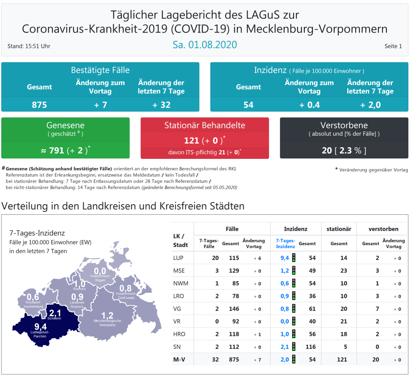 In Mecklenburg-Vorpommern sind bis heute 16 Uhr sieben Corona-Neuinfektionen gemeldet worden. Sechs der neuen Fälle sind aus dem Landkreis Ludwigslust-Parchim gemeldet worden. Insgesamt wurden in MB damit bisher 875 Infektionen festgestellt.