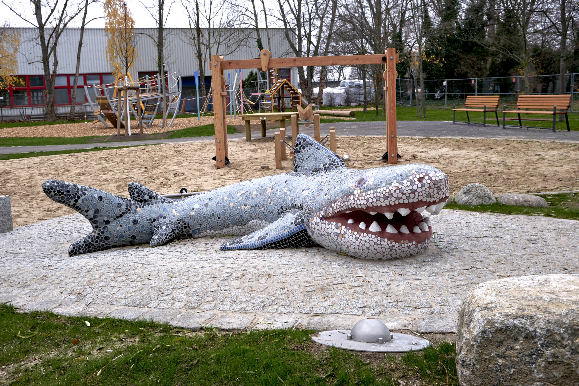 Ihre phantasievollen Spielplätze und Skulpturen aus Stein und Mosaik erhalten vielerorts in Deutschland Aufmerksamkeit und regen Stadtväter an,bei Jana Wolf anzuklopfen. Die Hai-Skulptur erfreut die Kinder auf einem Spielplatz in Berlin-Spandau.