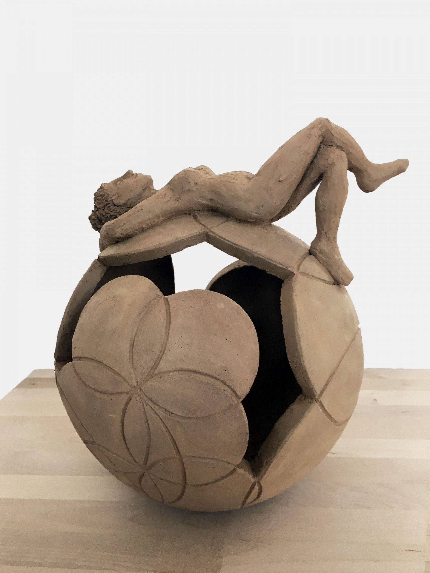 Manchmal schließen sich auch Kreise. So hat die Grafikdesignerin als Schülerin und als Studentin mehrere Praktika in der Werkstatt des Keramikers Franz Poppe gemacht. Und dort, sagt sie, hat sie die Kugel von Grund auf erlernt – wie man sie formt und wie daraus gebrochene oder geflochtene Kugeln entstehen können. 2020 hat sie begonnen, ihren Traum anzupacken. Ein Glück, dass ihre Wohnung nicht mehr genug Platz für die Skulpturen bot. So entschloss sie sich, bei ihrem „Meister“ Franz Poppe anzufragen. Mit dem Resultat, dass Nadine Twieg an dem Ort in ihrer Heimatstadt, wo sie von der Pike auf gelernt hat, erstmals ihre Tonskulpturen ausstellt.