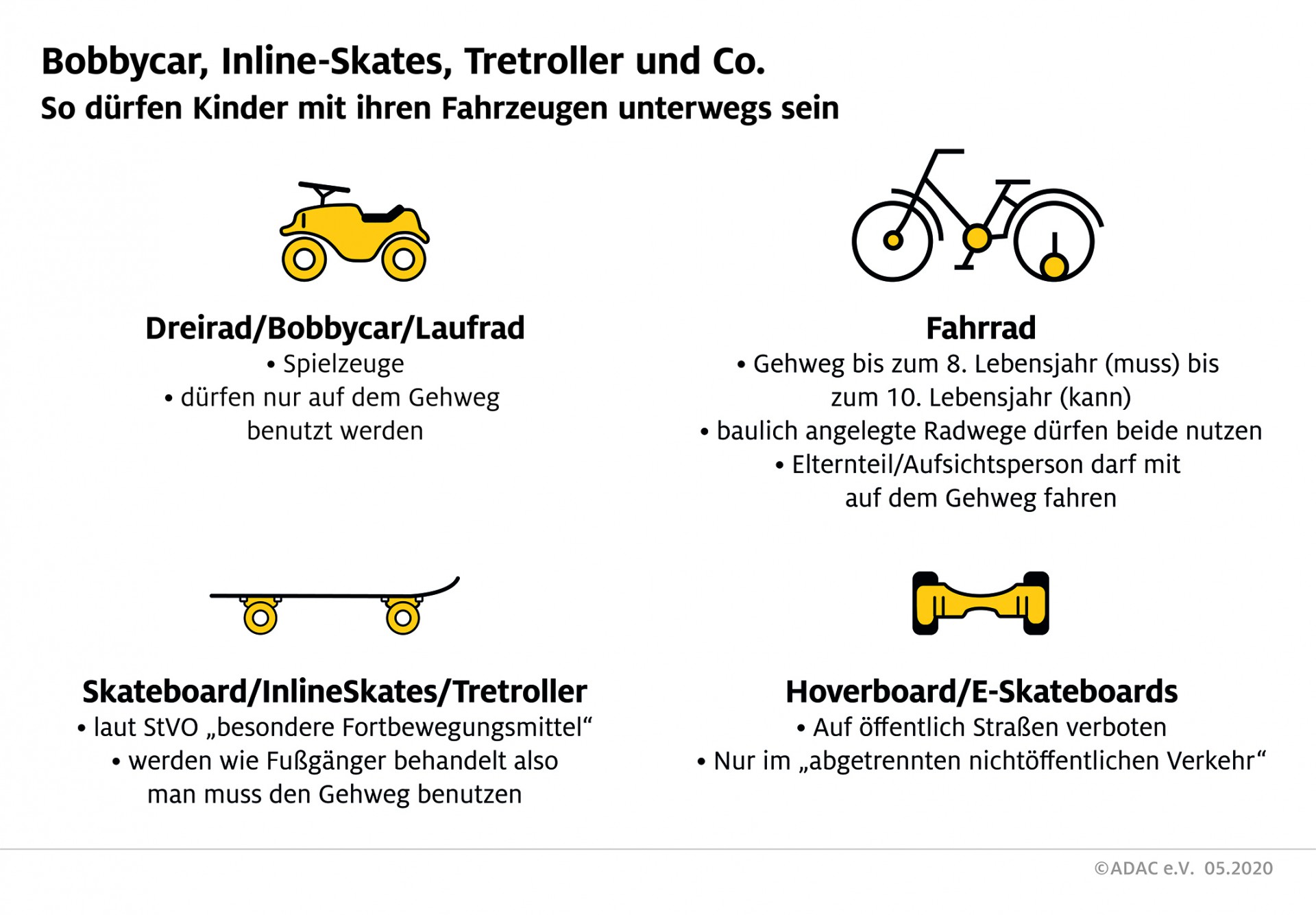 Kinder können und wollen heute schon mobil sein. Doch wo sie in welchem Alter und vor allem mit welchen Fahrzeugen unterwegs sein dürfen, ist nicht immer bekannt. Um sicherzugehen, dass nur in einem angemessenen und sicheren Verkehrsbereich gefahren wird, hat der ADAC zusammengestellt, welche Kindergefährte wo unterwegs sein dürfen.